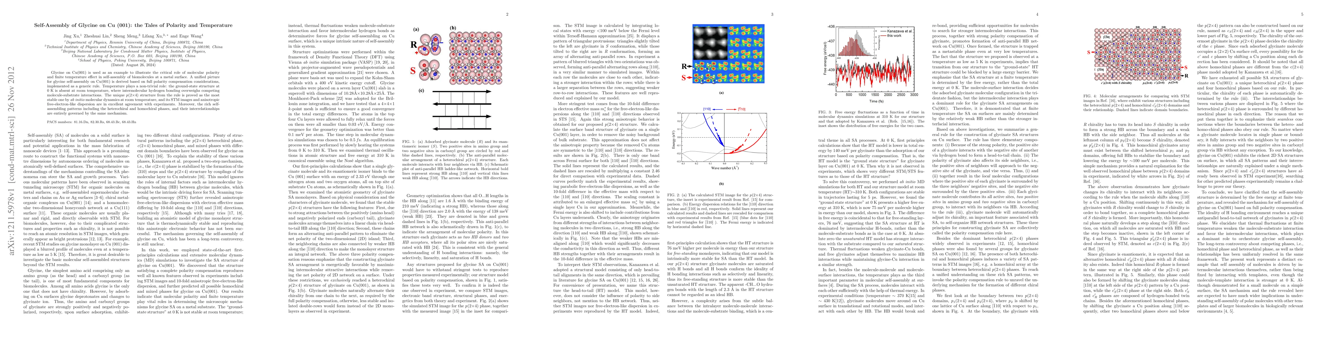 Glycine on Cu(001) is used as an example to illustrate the critical role of molecular polarity and finite temperature effect in self-assembly of biomolecules at a metal surface. A unified picture for glycine self-assembly on Cu(001) is derived based on full polarity compensation considerations, implemented as a generic rule. Temperature plays a non-trivial role: the ground-state structure at 0 K is absent at room temperature, where intermolecular hydrogen bonding overweighs competing molecule-substrate interactions. The unique p(2X4) structure from the rule is proved as the most stable one by ab initio molecular dynamics at room temperature, and its STM images and anisotropic free-electron-like dispersion are in excellent agreement with experiments. Moreover, the rich self-assembling patterns including the heterochiral and homochiral phases, and their interrelationships are entirely governed by the same mechanism.