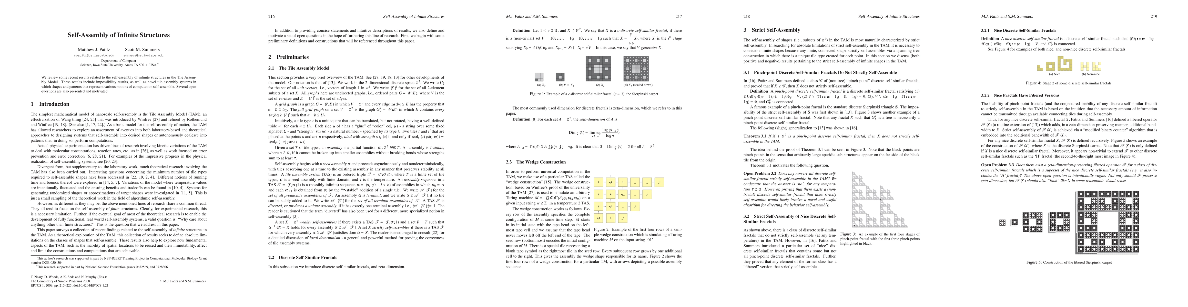 We review some recent results related to the self-assembly of infinite structures in the Tile Assembly Model. These results include impossibility results, as well as novel tile assembly systems in which shapes and patterns that represent various notions of computation self-assemble. Several open questions are also presented and motivated.