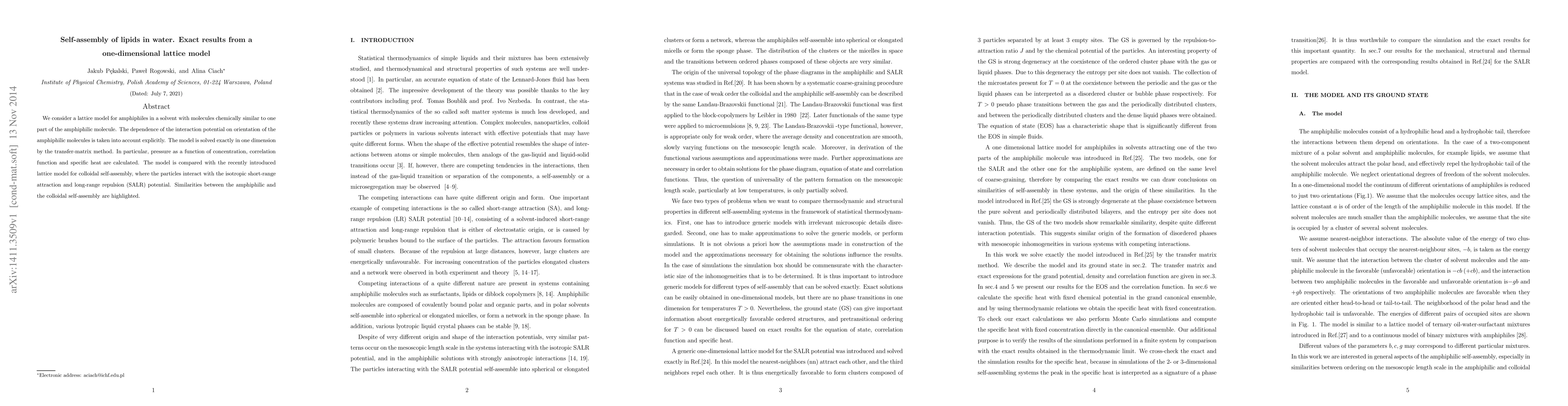 We consider a lattice model for amphiphiles in a solvent with molecules chemically similar to one part of the amphiphilic molecule. The dependence of the interaction potential on orientation of the amphiphilic molecules is taken into account explicitly. The model is solved exactly in one dimension by the transfer-matrix method. In particular, pressure as a function of concentration, correlation function and specific heat are calculated. The model is compared with the recently introduced lattice model for colloidal self-assembly, where the particles interact with the isotropic short-range attraction and long-range repulsion (SALR) potential. Similarities between the amphiphilic and the colloidal self-assembly are highlighted.