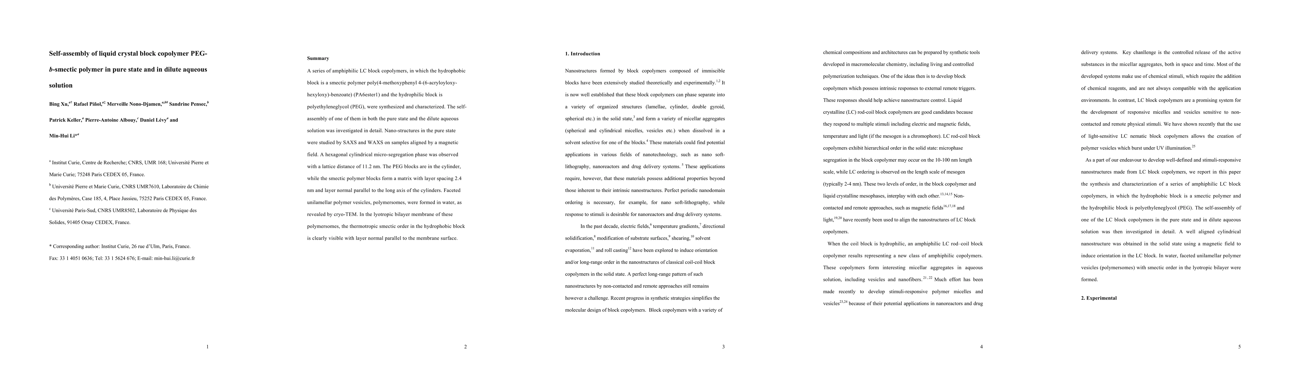 A series of amphiphilic LC block copolymers, in which the hydrophobic block is a smectic polymer poly(4-methoxyphenyl 4-(6-acryloyloxy-hexyloxy)-benzoate) (PA6ester1) and the hydrophilic block is polyethyleneglycol (PEG), were synthesized and characterized. The self-assembly of one of them in both the pure state and the dilute aqueous solution was investigated in detail. Nano-structures in the pure state were studied by SAXS and WAXS on samples aligned by a magnetic field. A hexagonal cylindrical micro-segregation phase was observed with a lattice distance of 11.2 nm. The PEG blocks are in the cylinder, while the smectic polymer blocks form a matrix with layer spacing 2.4 nm and layer normal parallel to the long axis of the cylinders. Faceted unilamellar polymer vesicles, polymersomes, were formed in water, as revealed by cryo-TEM. In the lyotropic bilayer membrane of these polymersomes, the thermotropic smectic order in the hydrophobic block is clearly visible with layer normal parallel to the membrane surface.