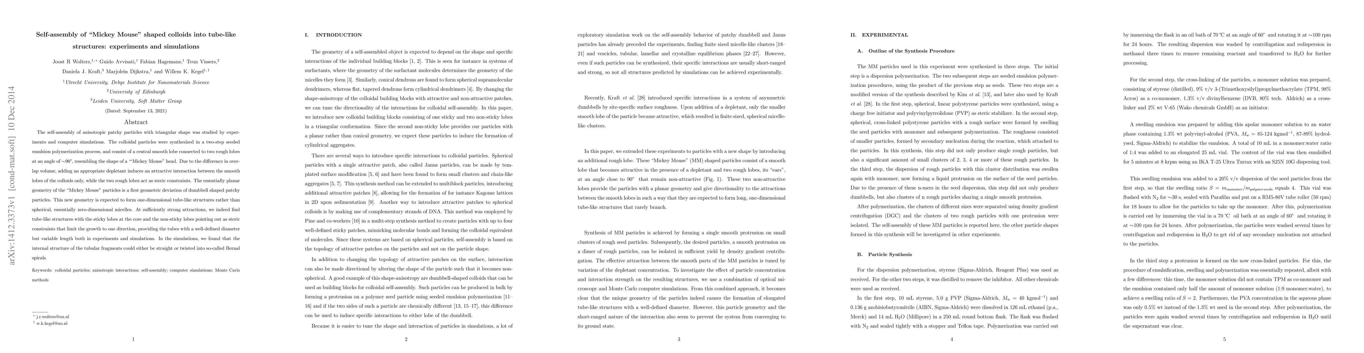 This paper investigates the self-assembly of "Mickey Mouse" shaped colloids into tube-like structures through experiments and simulations. The unique geometry of these anisotropic particles leads to the formation of one-dimensional tubes with a well-defined diameter and variable length.
