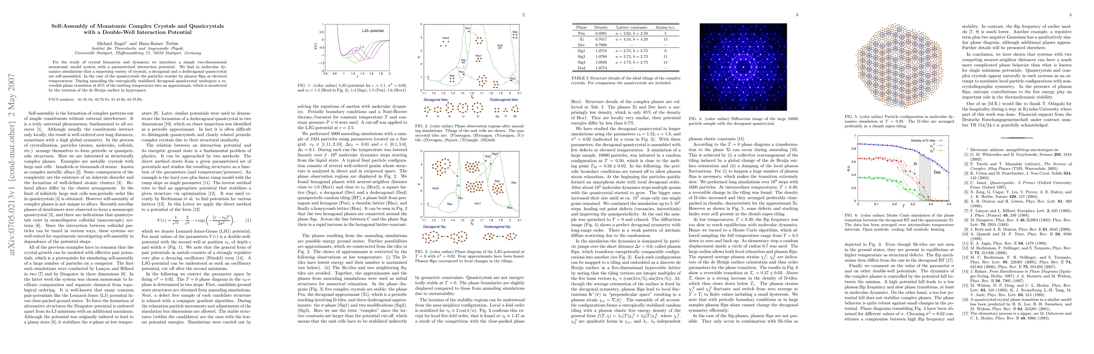 For the study of crystal formation and dynamics we introduce a simple two-dimensional monatomic model system with a parametrized interaction potential. We find in molecular dynamics simulations that a surprising variety of crystals, a decagonal and a dodecagonal quasicrystal are self-assembled. In the case of the quasicrystals the particles reorder by phason flips at elevated temperatures. During annealing the entropically stabilized decagonal quasicrystal undergoes a reversible phase transition at 65% of the melting temperature into an approximant, which is monitored by the rotation of the de Bruijn surface in hyperspace.