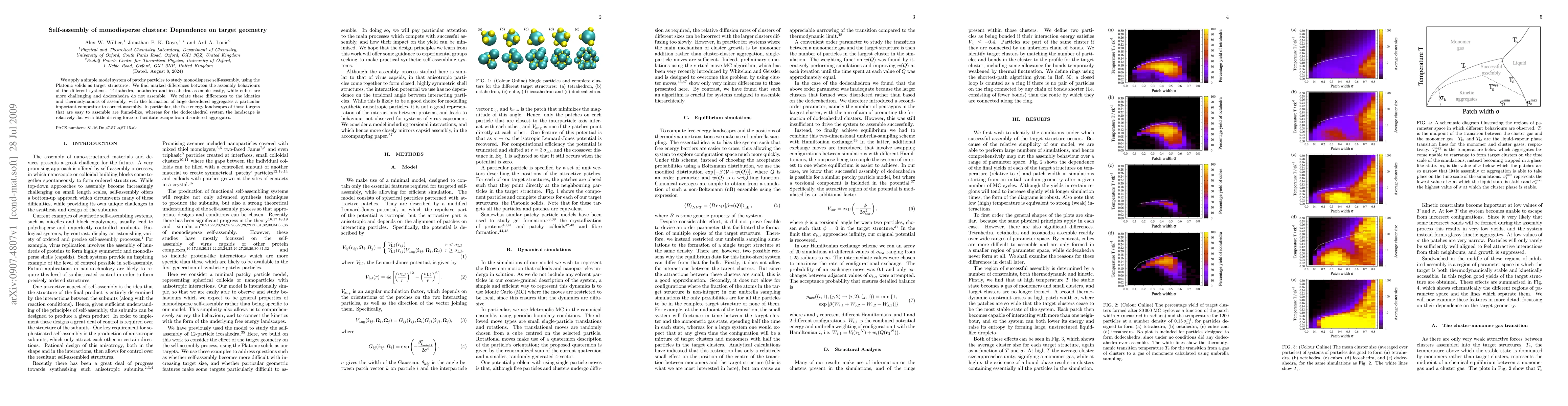 This paper investigates the self-assembly of monodisperse clusters using a model of patchy particles and Platonic solids as target geometries. It finds that tetrahedra, octahedra, and icosahedra assemble easily, while cubes are challenging and dodecahedra do not assemble, attributing these differences to the kinetics and thermodynamics of assembly, particularly the free energy landscapes.
