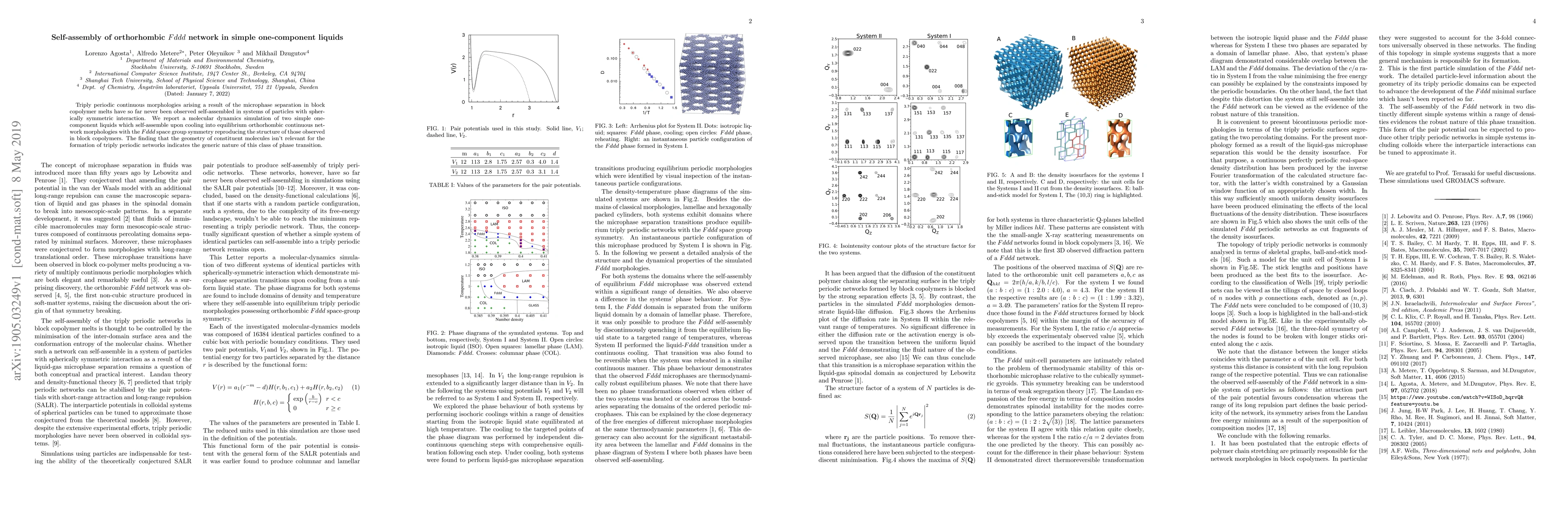 This research reports the self-assembly of orthorhombic Fddd network structures in simple one-component liquids through molecular dynamics simulations, revealing that these triply periodic networks can form without the need for complex block copolymer interactions, indicating a generic nature of this phase transition.