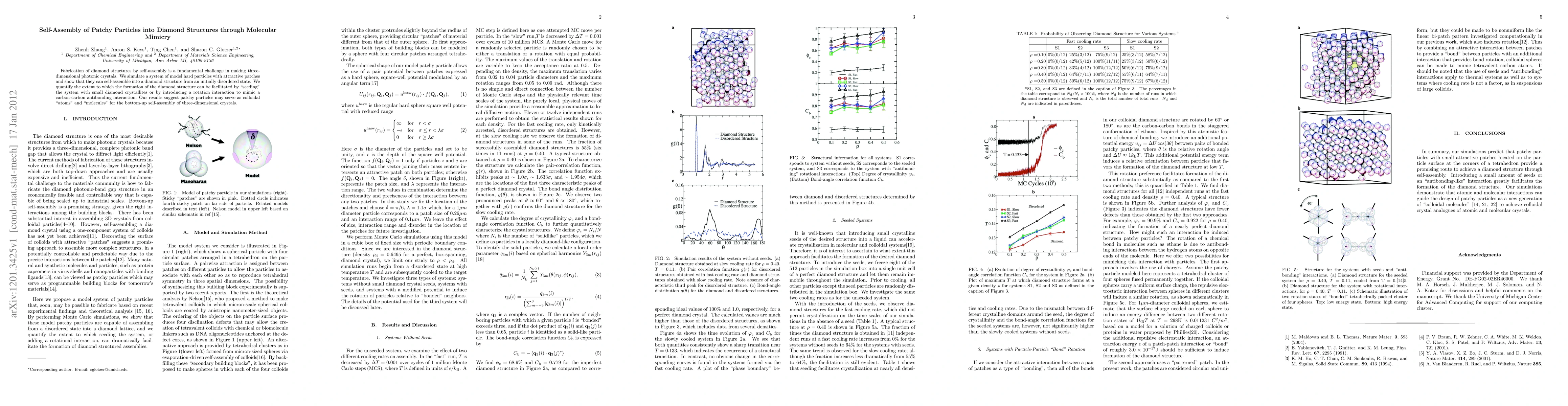 This paper demonstrates the self-assembly of patchy particles into diamond structures through molecular mimicry, showing that these particles can form diamond lattices when seeded with small crystallites or with added rotational interactions. The findings suggest that patchy particles can be used for the bottom-up construction of three-dimensional photonic crystals.