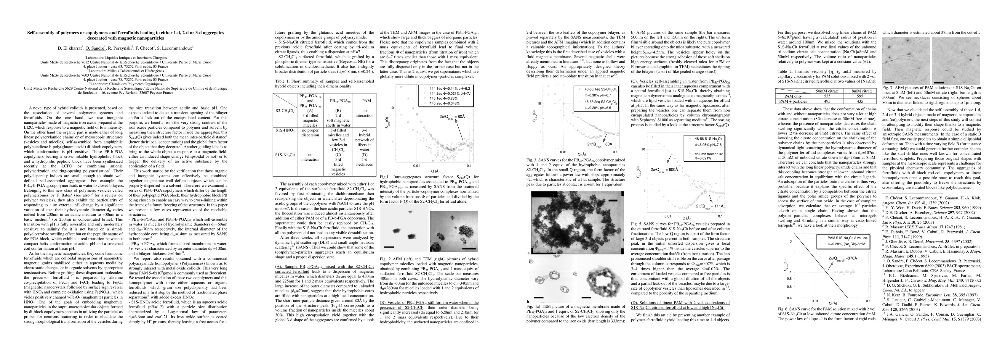 A novel type of hybrid colloids is presented, based on the association of several polymeric systems and ferrofluids. On the one hand, we use inorganic nanoparticles made of magnetic iron oxide prepared at the LI2C, which response to a magnetic field of low intensity. On the other hand the organic part is made either of long linear polyacrylamide chains or of mesoscopic structures (vesicles and micelles) self-assembled from amphiphile polybutadiene-b-poly(glutamic acid) di-block copolymers, which conformation is pH-sensitive.