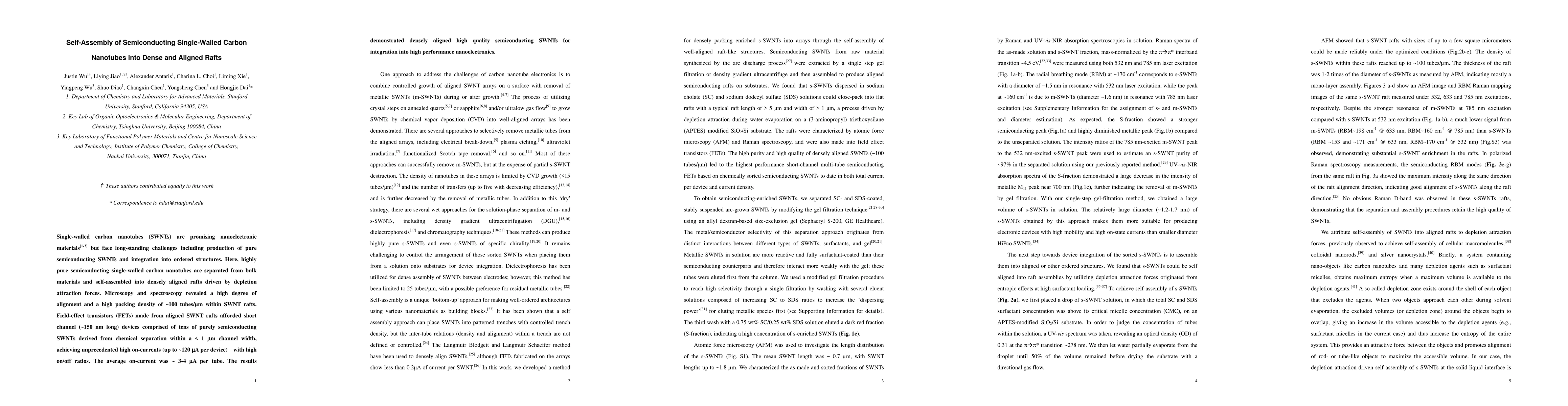 This research paper details the production of highly pure semiconducting single-walled carbon nanotubes (SWNTs) that are self-assembled into densely aligned rafts using depletion attraction forces. These rafts enable the fabrication of field-effect transistors with high on-currents and on/off ratios, showcasing potential for high-performance nanoelectronics.