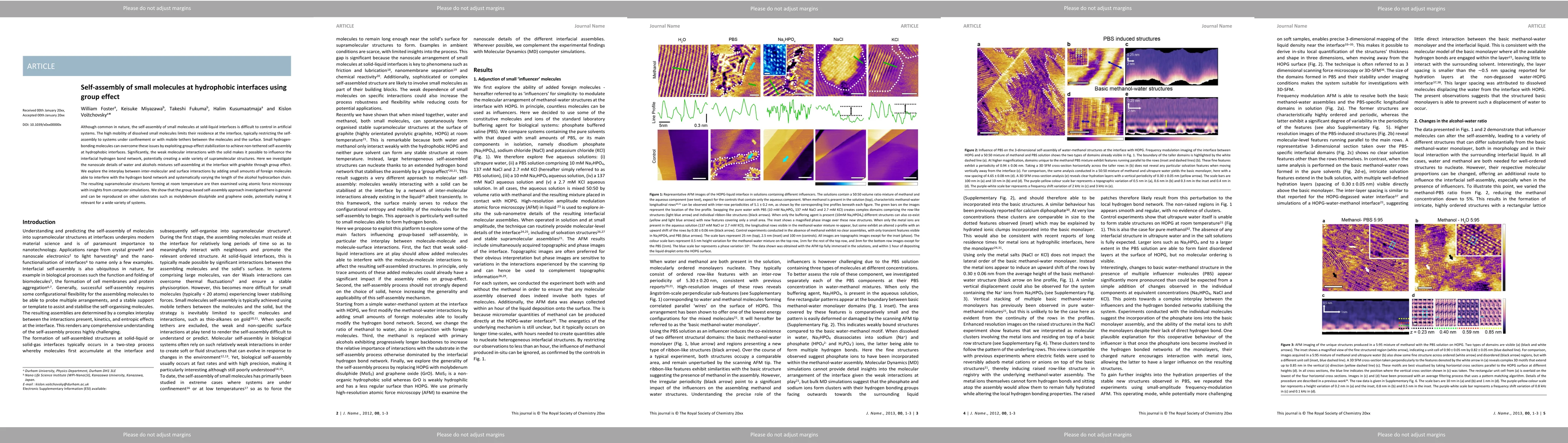 This paper explores the self-assembly of small hydrogen-bonding molecules at hydrophobic interfaces using group effect stabilization, demonstrating the formation of supramolecular structures on graphite, molybdenum disulphide, and graphene oxide through atomic force microscopy and simulations. The study highlights the influence of inter-molecular and surface interactions on the resulting nanoscale assemblies.