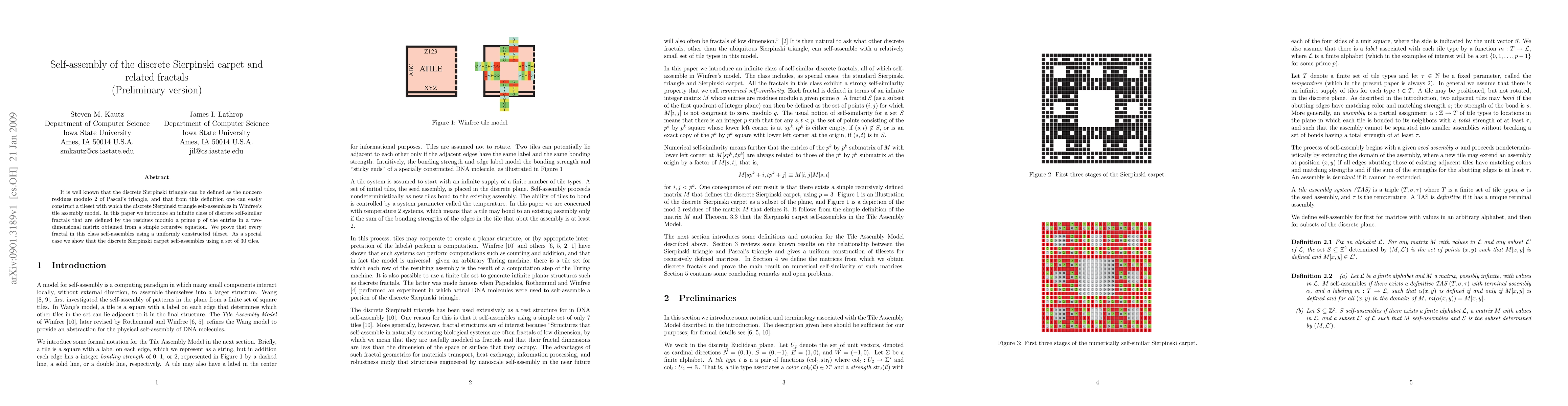 This paper introduces a new class of self-similar fractals defined by residues modulo primes of matrix entries derived from recursive equations, proving their self-assembly in Winfree's model, and specifically demonstrating the self-assembly of the discrete Sierpinski carpet with a set of 30 tiles.