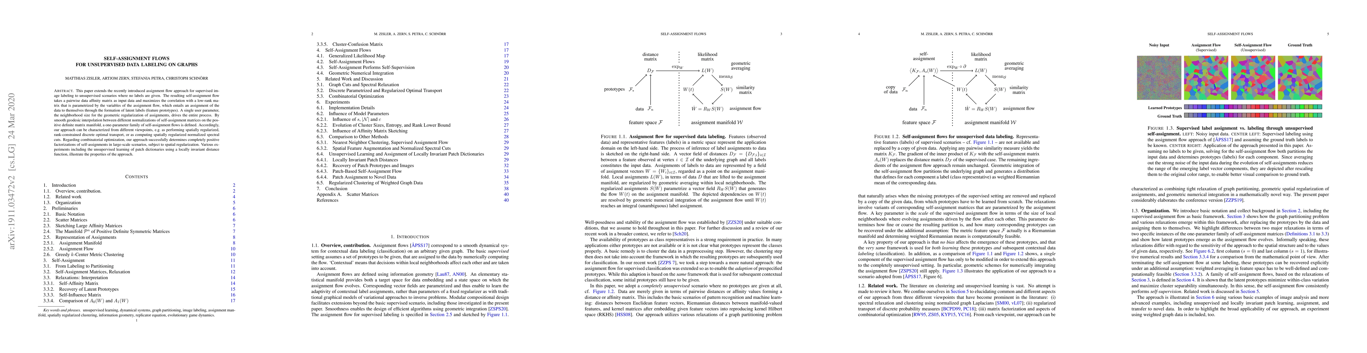 This paper extends the recently introduced assignment flow approach for supervised image labeling to unsupervised scenarios where no labels are given. The resulting self-assignment flow takes a pairwise data affinity matrix as input data and maximizes the correlation with a low-rank matrix that is parametrized by the variables of the assignment flow, which entails an assignment of the data to themselves through the formation of latent labels (feature prototypes). A single user parameter, the neighborhood size for the geometric regularization of assignments, drives the entire process. By smooth geodesic interpolation between different normalizations of self-assignment matrices on the positive definite matrix manifold, a one-parameter family of self-assignment flows is defined. Accordingly, our approach can be characterized from different viewpoints, e.g. as performing spatially regularized, rank-constrained discrete optimal transport, or as computing spatially regularized normalized spectral cuts. Regarding combinatorial optimization, our approach successfully determines completely positive factorizations of self-assignments in large-scale scenarios, subject to spatial regularization. Various experiments including the unsupervised learning of patch dictionaries using a locally invariant distance function, illustrate the properties of the approach.