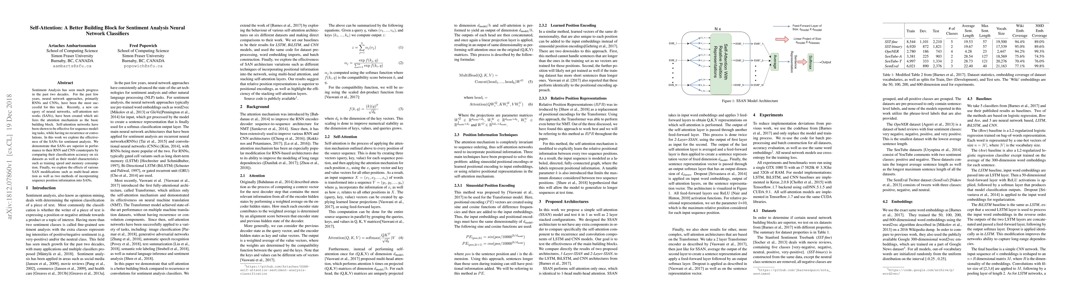 Sentiment Analysis has seen much progress in the past two decades. For the past few years, neural network approaches, primarily RNNs and CNNs, have been the most successful for this task. Recently, a new category of neural networks, self-attention networks (SANs), have been created which utilizes the attention mechanism as the basic building block. Self-attention networks have been shown to be effective for sequence modeling tasks, while having no recurrence or convolutions. In this work we explore the effectiveness of the SANs for sentiment analysis. We demonstrate that SANs are superior in performance to their RNN and CNN counterparts by comparing their classification accuracy on six datasets as well as their model characteristics such as training speed and memory consumption. Finally, we explore the effects of various SAN modifications such as multi-head attention as well as two methods of incorporating sequence position information into SANs.