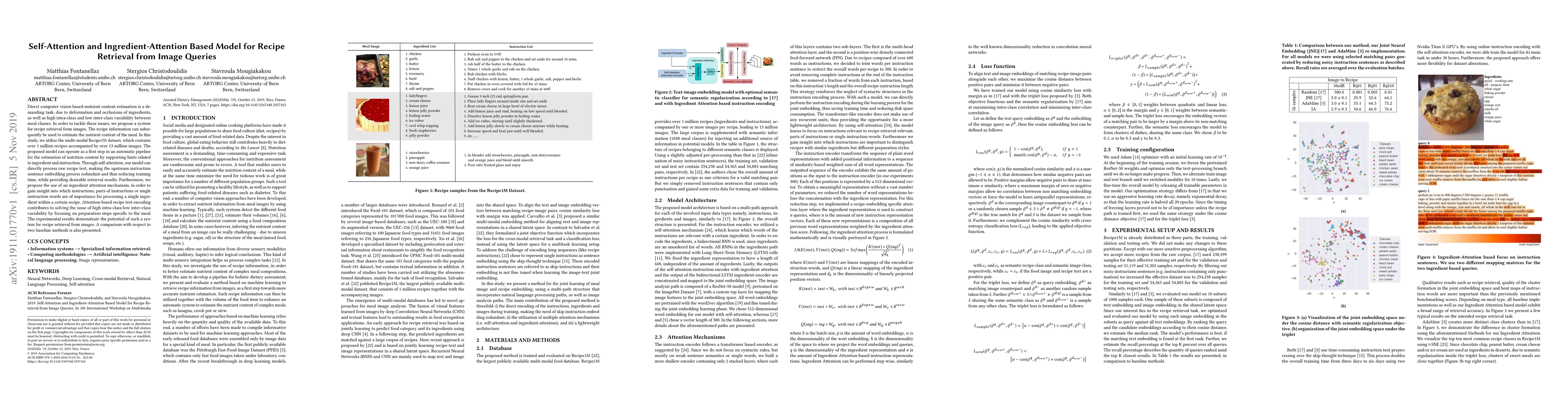 This paper proposes a self-attention and ingredient-attention based model for retrieving recipes from image queries, aiming to estimate nutrient content. The model processes raw recipe text directly, reducing training time and improving retrieval accuracy by focusing on specific preparation steps.