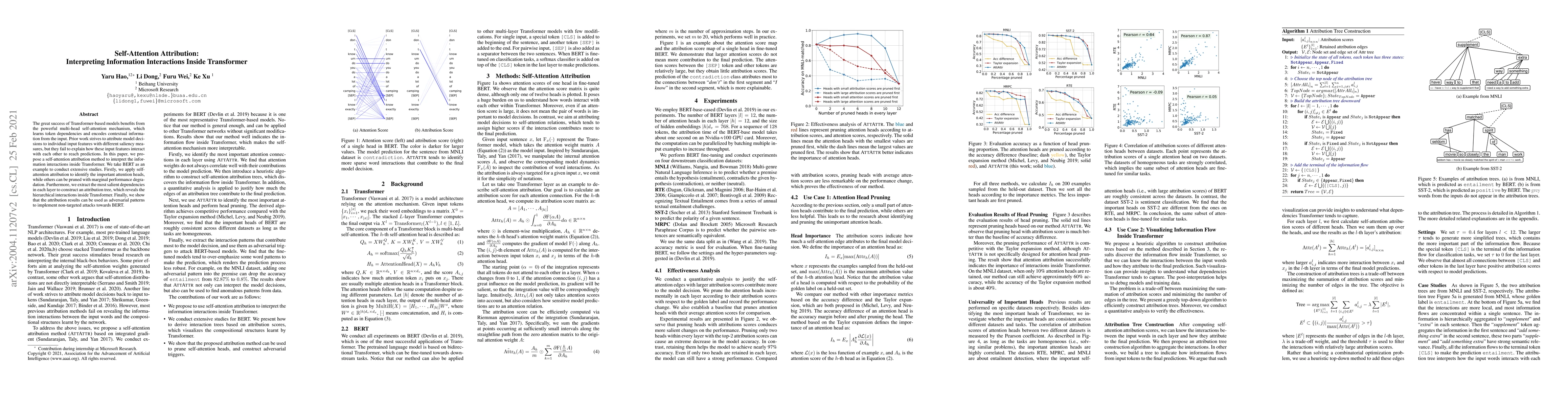 This paper proposes a self-attention attribution method to interpret how information interacts within Transformer models, specifically focusing on BERT. The method identifies important attention heads and constructs an attribution tree to reveal hierarchical interactions, while also demonstrating its use in non-targeted adversarial attacks.