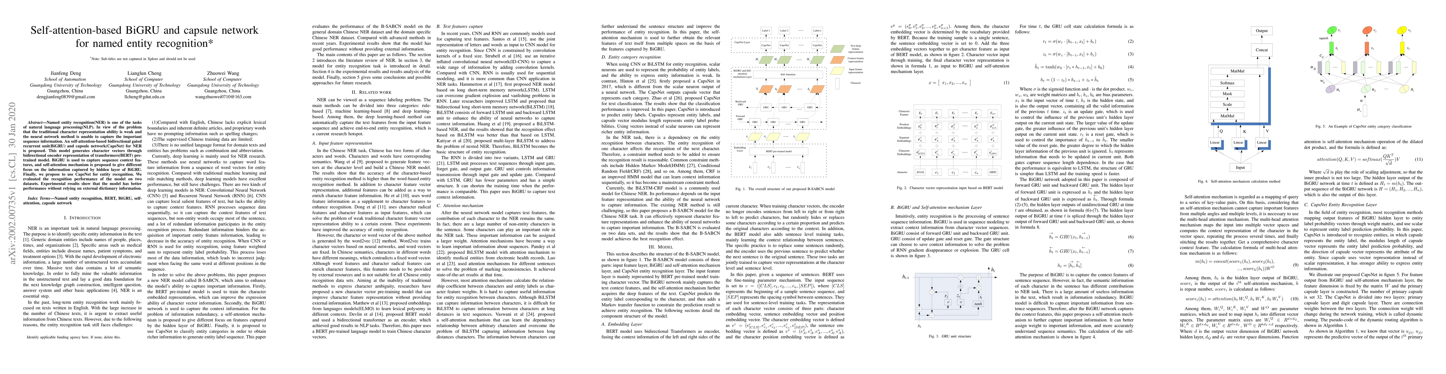 Named entity recognition(NER) is one of the tasks of natural language processing(NLP). In view of the problem that the traditional character representation ability is weak and the neural network method is unable to capture the important sequence information. An self-attention-based bidirectional gated recurrent unit(BiGRU) and capsule network(CapsNet) for NER is proposed. This model generates character vectors through bidirectional encoder representation of transformers(BERT) pre-trained model. BiGRU is used to capture sequence context features, and self-attention mechanism is proposed to give different focus on the information captured by hidden layer of BiGRU. Finally, we propose to use CapsNet for entity recognition. We evaluated the recognition performance of the model on two datasets. Experimental results show that the model has better performance without relying on external dictionary information.