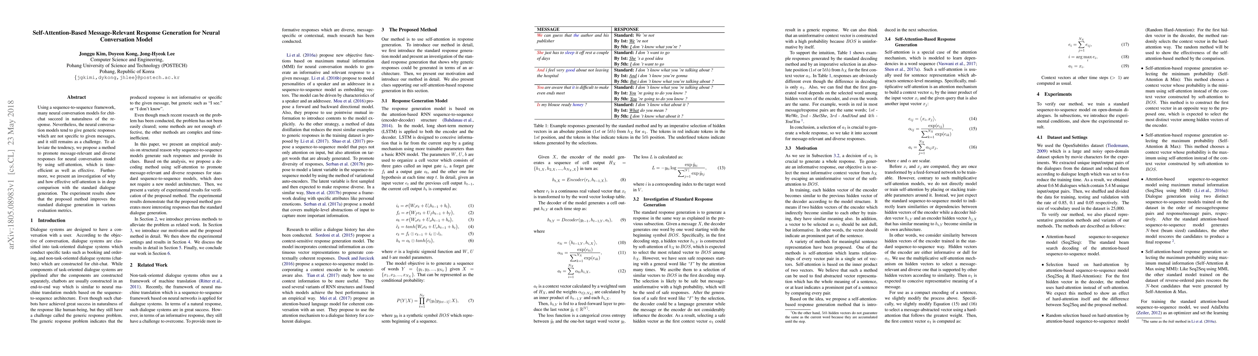 This paper proposes a self-attention-based method to generate more message-relevant and diverse responses in neural conversation models. The approach enhances the naturalness of responses and outperforms standard dialogue generation in various evaluation metrics.