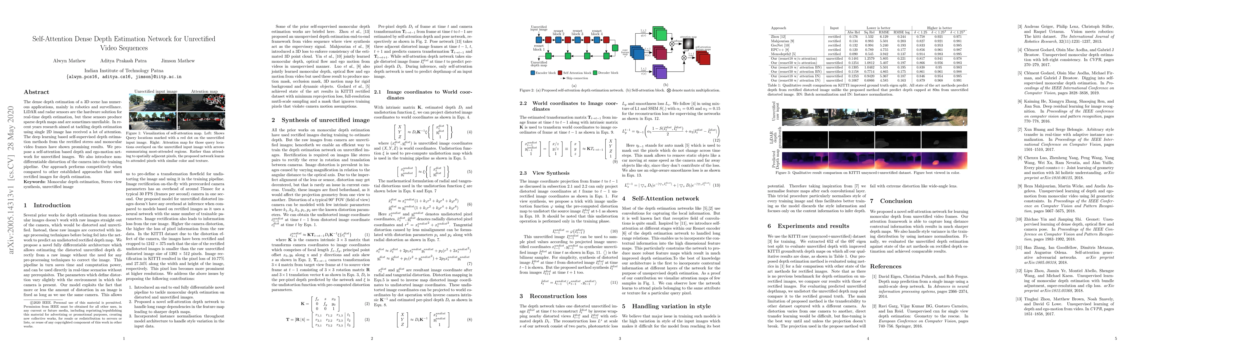 This paper proposes a self-attention dense depth estimation network for unrectified video sequences, introducing a non-differentiable distortion model to simulate camera distortions. The method shows competitive performance compared to established techniques that rely on rectified images.