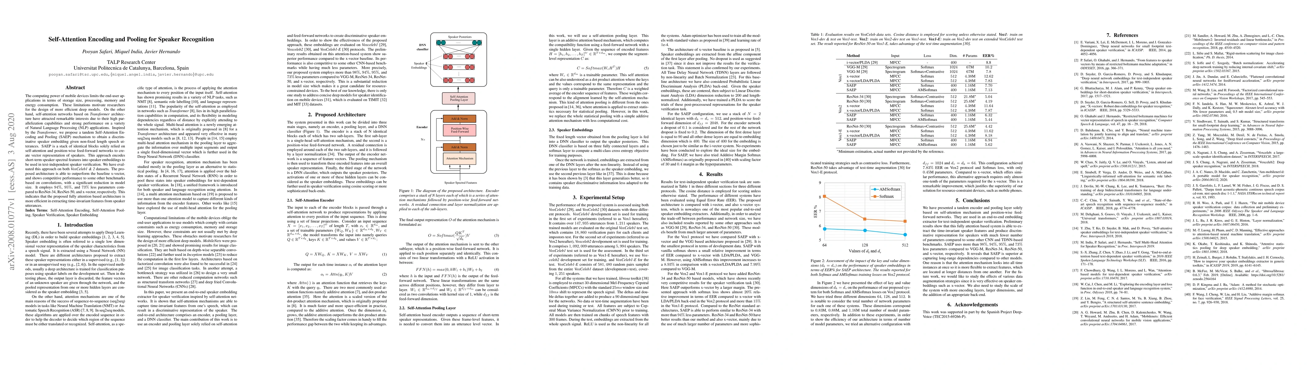 The paper proposes a Self-Attention Encoding and Pooling (SAEP) mechanism for speaker recognition, leveraging Transformer architecture to create efficient speaker embeddings. The SAEP model achieves competitive performance on VoxCeleb datasets while significantly reducing model size and parameters compared to convolutional baselines.
