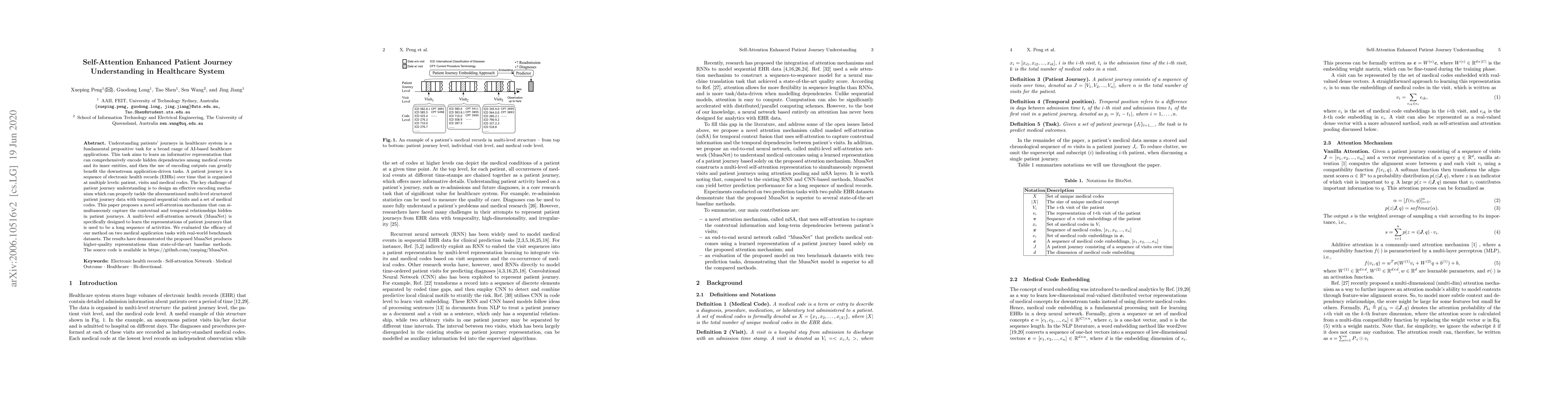 Understanding patients' journeys in healthcare system is a fundamental prepositive task for a broad range of AI-based healthcare applications. This task aims to learn an informative representation that can comprehensively encode hidden dependencies among medical events and its inner entities, and then the use of encoding outputs can greatly benefit the downstream application-driven tasks. A patient journey is a sequence of electronic health records (EHRs) over time that is organized at multiple levels: patient, visits and medical codes. The key challenge of patient journey understanding is to design an effective encoding mechanism which can properly tackle the aforementioned multi-level structured patient journey data with temporal sequential visits and a set of medical codes. This paper proposes a novel self-attention mechanism that can simultaneously capture the contextual and temporal relationships hidden in patient journeys. A multi-level self-attention network (MusaNet) is specifically designed to learn the representations of patient journeys that is used to be a long sequence of activities. The MusaNet is trained in end-to-end manner using the training data derived from EHRs. We evaluated the efficacy of our method on two medical application tasks with real-world benchmark datasets. The results have demonstrated the proposed MusaNet produces higher-quality representations than state-of-the-art baseline methods. The source code is available in https://github.com/xueping/MusaNet.