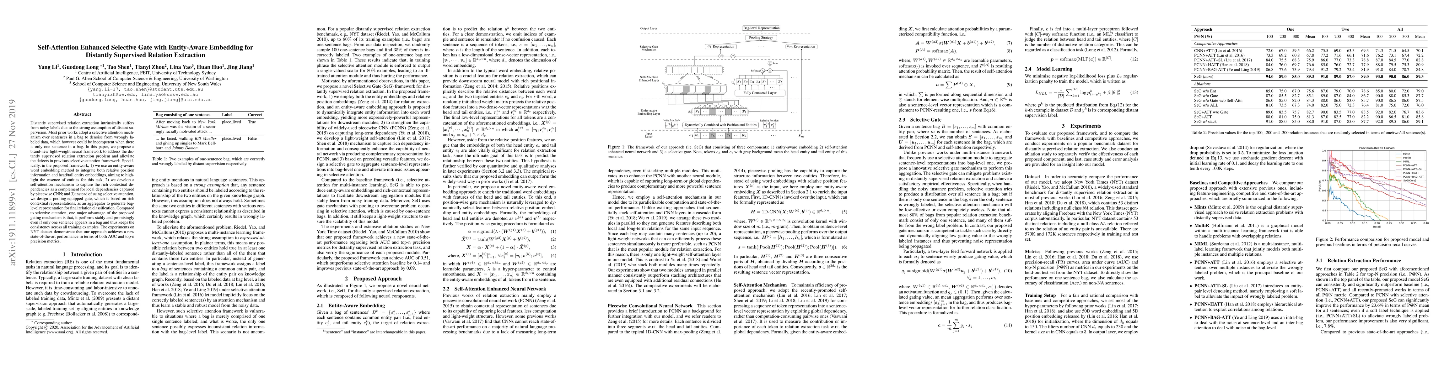 This paper proposes a novel neural framework for distantly supervised relation extraction that enhances a selective gate with self-attention and entity-aware embeddings. The framework uses entity-aware word embeddings and a self-attention mechanism to capture contextual dependencies, and a pooling-equipped gate to aggregate sentence representations, achieving state-of-the-art performance on the NYT dataset.