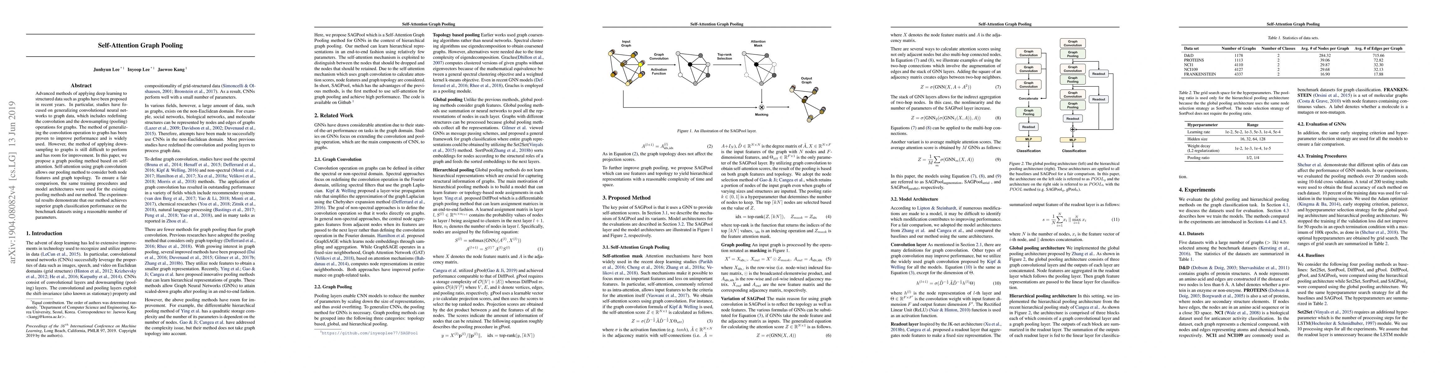 This paper proposes a self-attention graph pooling method that leverages graph convolution to consider both node features and graph topology, achieving superior graph classification performance compared to existing pooling methods on benchmark datasets. The method uses the same training procedures and model architectures for fair comparison.
