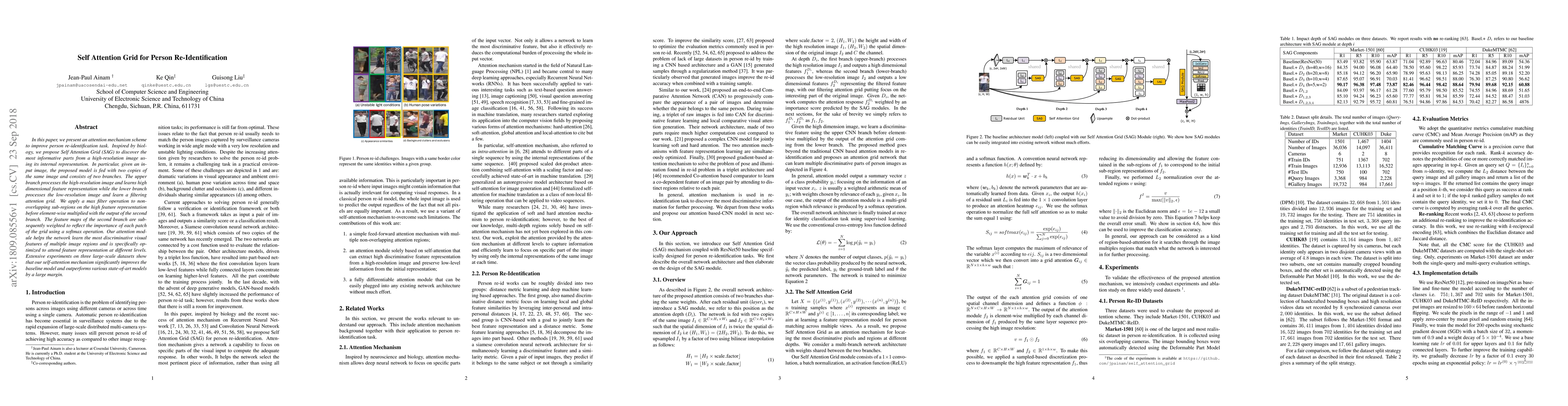 This paper proposes Self Attention Grid (SAG), a method that improves person re-identification task by learning the most informative parts of an image through its internal representation. It significantly outperforms state-of-the-art models on three large-scale datasets.