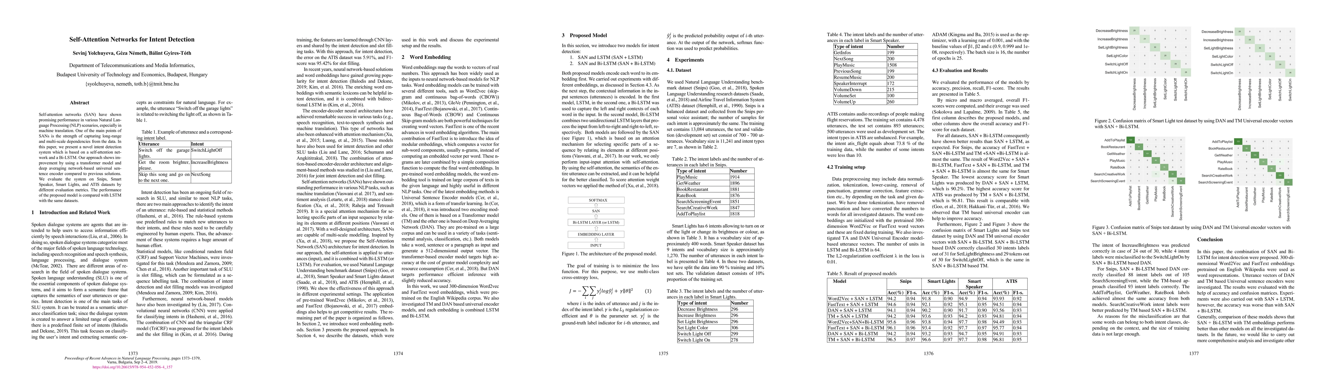 Self-attention networks (SAN) have shown promising performance in various Natural Language Processing (NLP) scenarios, especially in machine translation. One of the main points of SANs is the strength of capturing long-range and multi-scale dependencies from the data. In this paper, we present a novel intent detection system which is based on a self-attention network and a Bi-LSTM. Our approach shows improvement by using a transformer model and deep averaging network-based universal sentence encoder compared to previous solutions. We evaluate the system on Snips, Smart Speaker, Smart Lights, and ATIS datasets by different evaluation metrics. The performance of the proposed model is compared with LSTM with the same datasets.