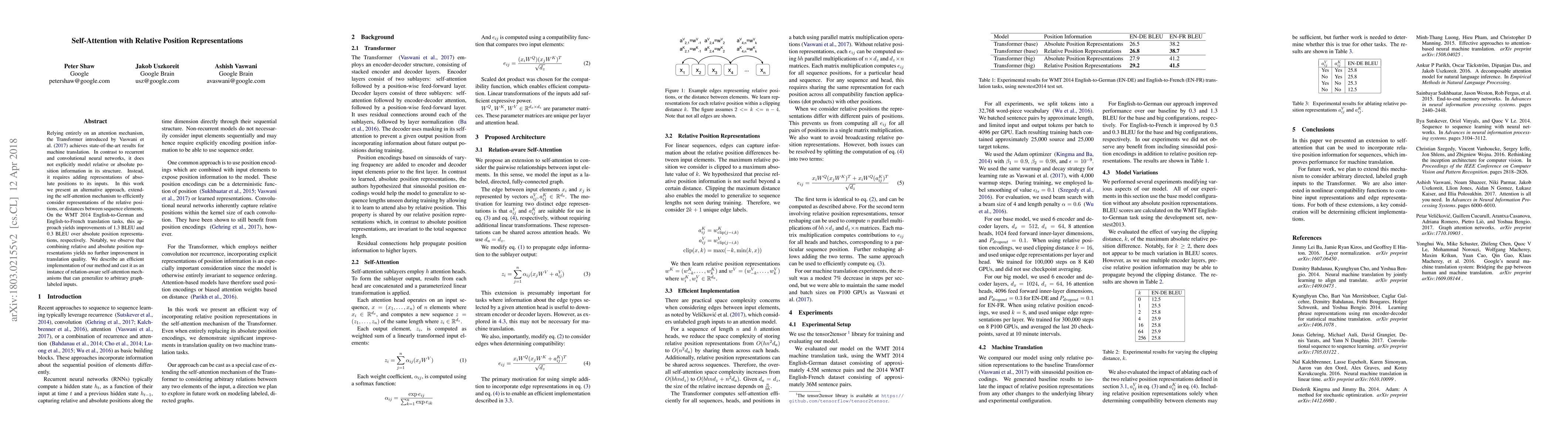 This paper proposes a self-attention mechanism that incorporates relative position representations, improving translation performance on WMT 2014 tasks by 1.3 BLEU for English-to-German and 0.3 BLEU for English-to-French. Combining relative and absolute positions does not yield further gains, highlighting the effectiveness of relative positioning alone.