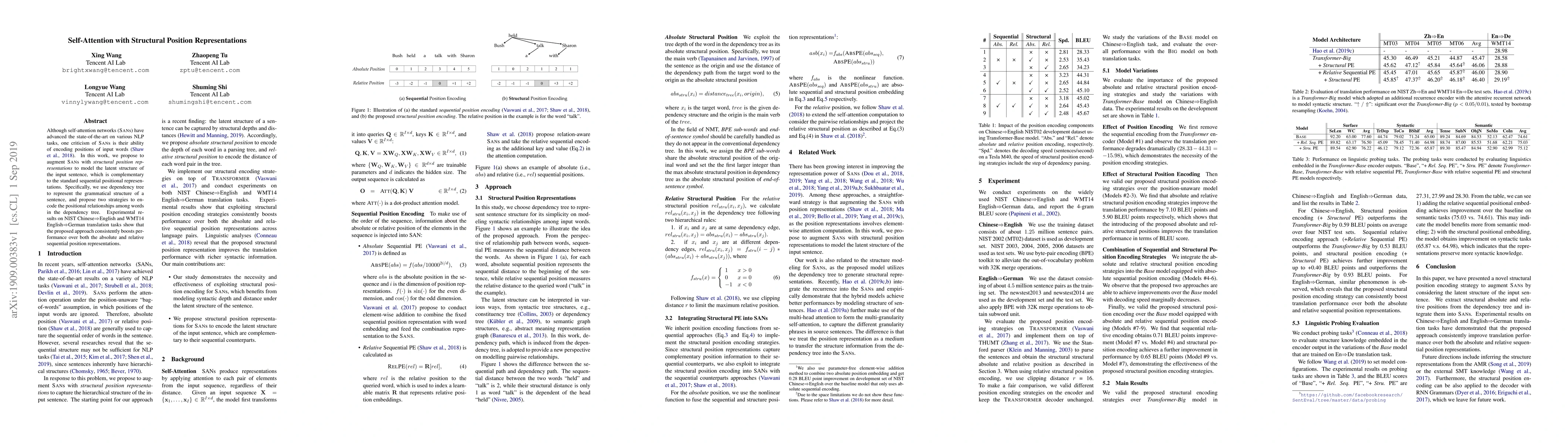 This paper proposes augmenting self-attention networks with structural position representations derived from dependency trees to enhance the encoding of sentence grammatical structure. The approach consistently improves translation performance over traditional sequential positional representations.