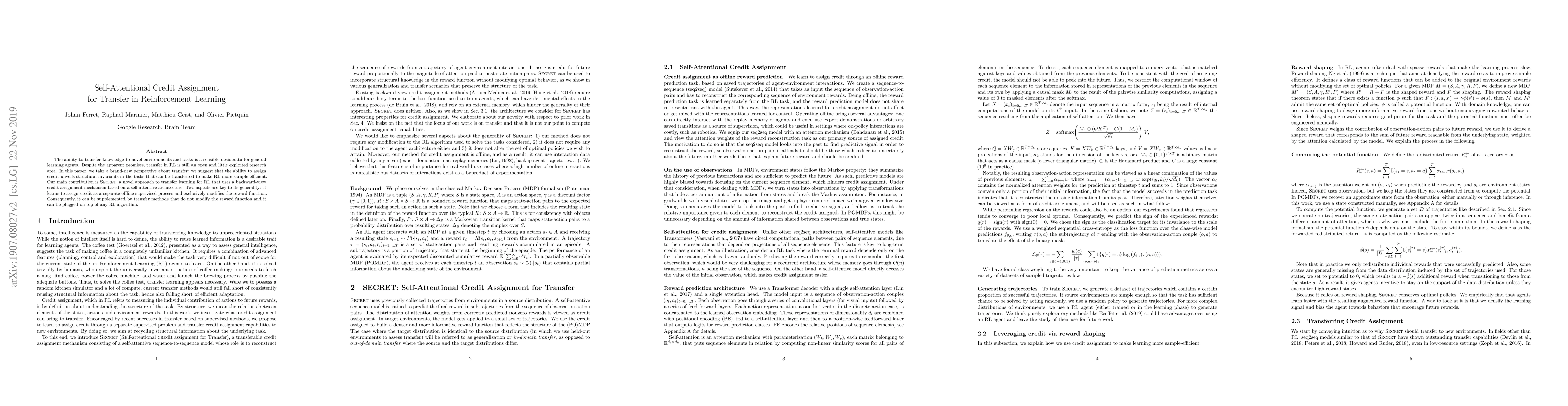The ability to transfer knowledge to novel environments and tasks is a sensible desiderata for general learning agents. Despite the apparent promises, transfer in RL is still an open and little exploited research area. In this paper, we take a brand-new perspective about transfer: we suggest that the ability to assign credit unveils structural invariants in the tasks that can be transferred to make RL more sample-efficient. Our main contribution is SECRET, a novel approach to transfer learning for RL that uses a backward-view credit assignment mechanism based on a self-attentive architecture. Two aspects are key to its generality: it learns to assign credit as a separate offline supervised process and exclusively modifies the reward function. Consequently, it can be supplemented by transfer methods that do not modify the reward function and it can be plugged on top of any RL algorithm.
