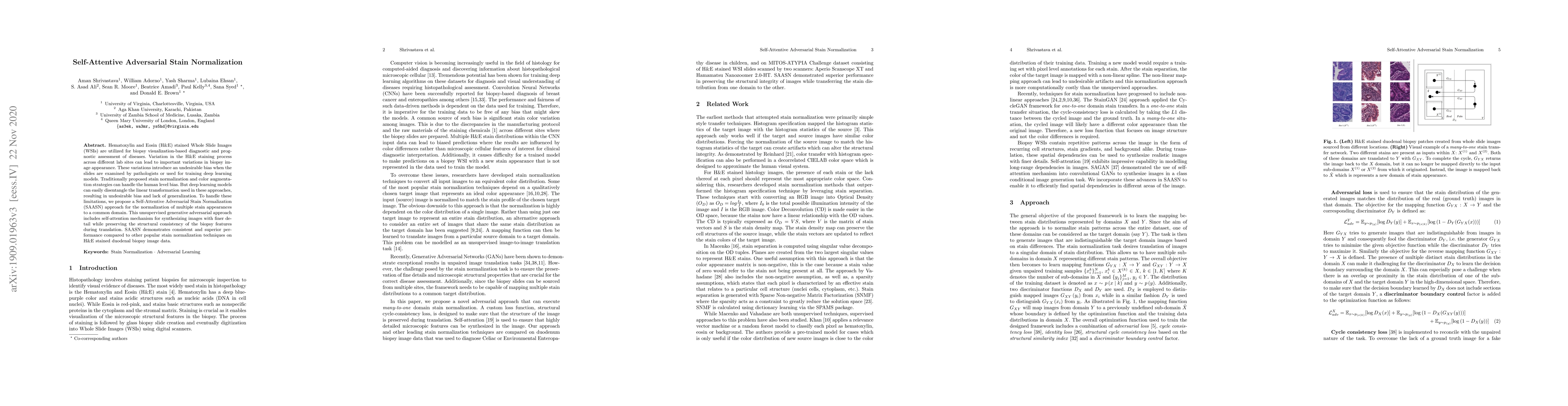 The paper proposes a Self-Attentive Adversarial Stain Normalization (SAASN) method to normalize variations in H&E stained Whole Slide Images, reducing bias for pathologists and deep learning models. SAASN uses an unsupervised generative adversarial technique with self-attention to maintain structural consistency, showing superior performance over other normalization techniques.