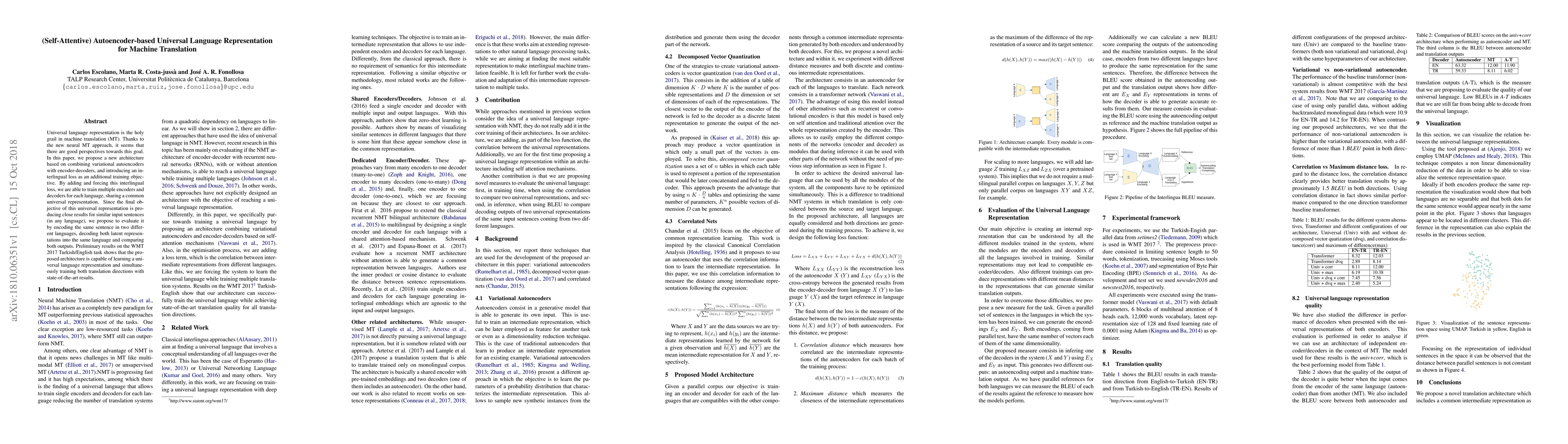 This paper proposes a self-attentive autoencoder architecture combining variational autoencoders with encoder-decoders to create a universal language representation for machine translation. The interlingual loss enables training multiple encoders and decoders sharing a common representation, achieving state-of-the-art results on the WMT 2017 Turkish/English task.