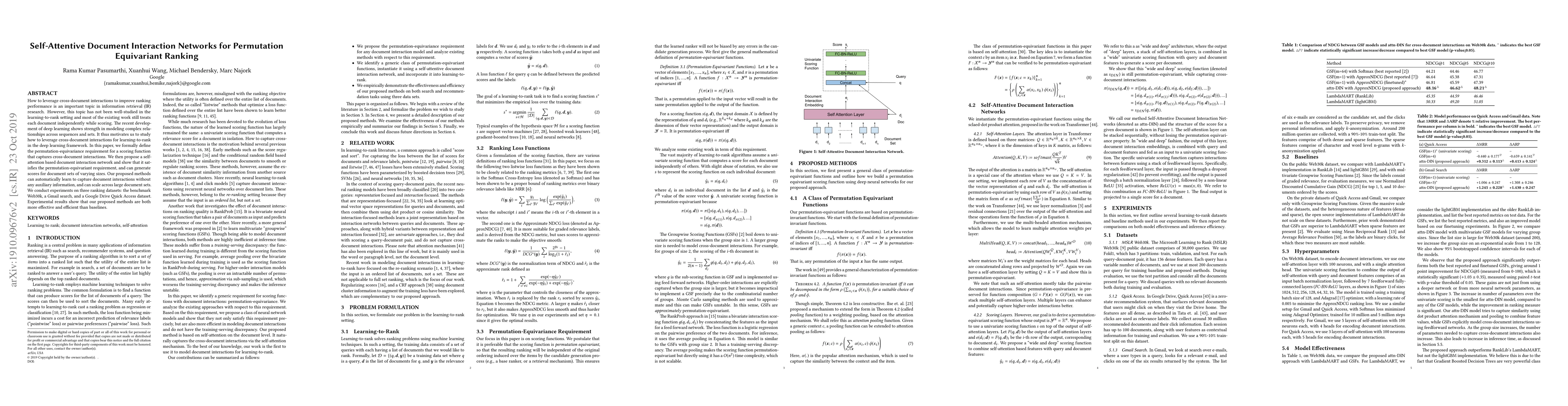 This paper proposes a self-attention based document interaction network to leverage cross-document interactions for permutation equivariant ranking in information retrieval, demonstrating effectiveness and efficiency over baselines on multiple datasets. The network satisfies permutation-equivariance and scales well to large document sets.