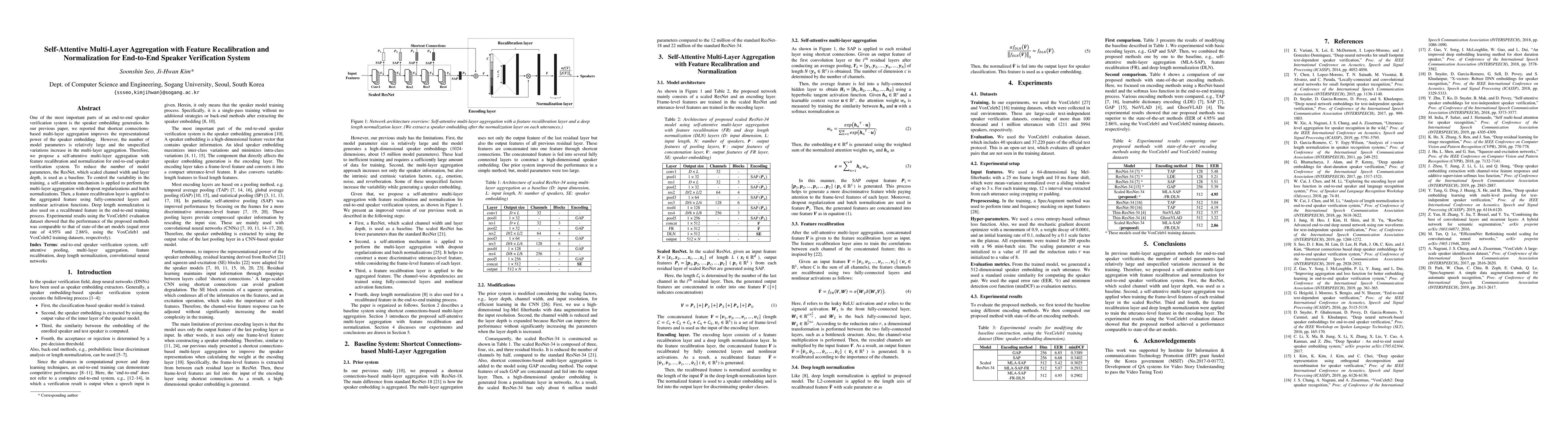 The paper proposes a self-attentive multi-layer aggregation method with feature recalibration and normalization for end-to-end speaker verification, achieving competitive performance (equal error rates of 4.95% and 2.86%) comparable to state-of-the-art models while controlling model parameters and variability.