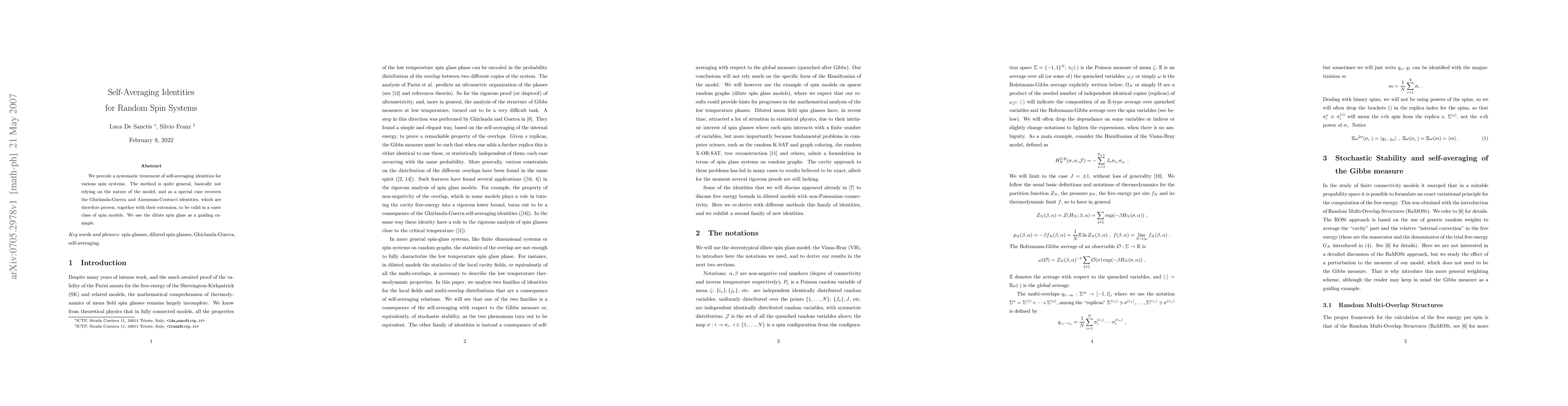 This paper systematically explores self-averaging identities in random spin systems, demonstrating a general method applicable to various models and proving the Ghirlanda-Guerra and Aizenman-Contucci identities, along with their extensions, for a wide class of spin models, exemplified through dilute spin glasses.