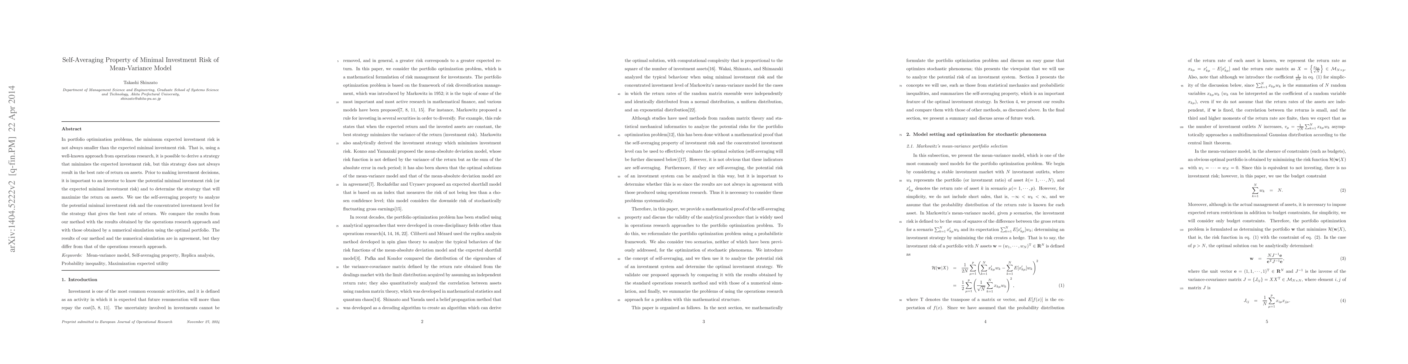 This paper explores the self-averaging property to analyze minimal investment risk in portfolio optimization, finding that strategies minimizing expected risk do not always maximize return. The proposed method aligns with numerical simulations but diverges from traditional operations research approaches.