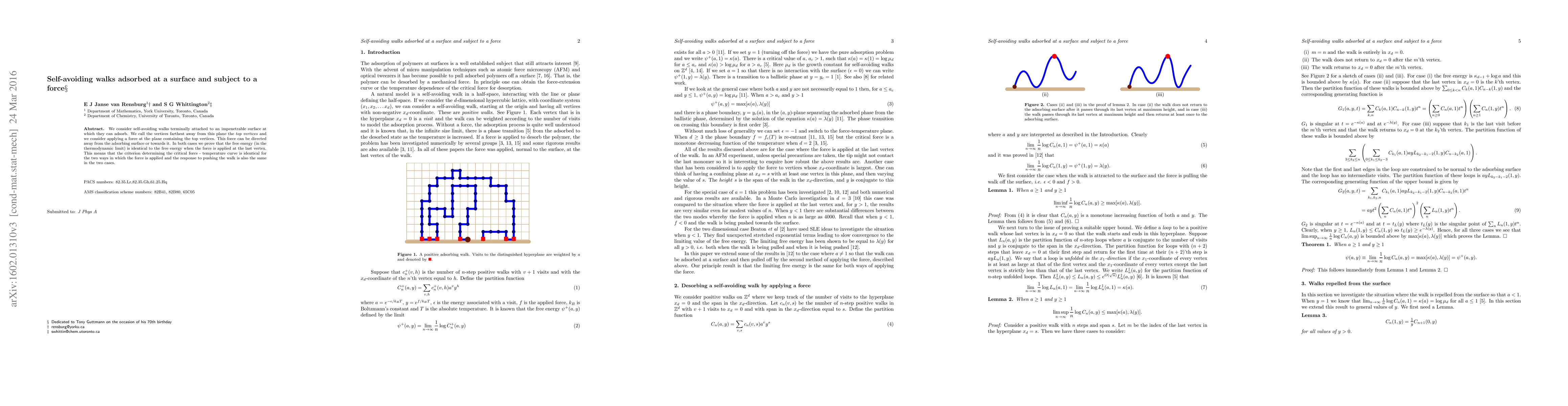 Researchers show that applying a force to a self-avoiding walk adsorbed at a surface has no effect on its free energy in the thermodynamic limit, meaning the critical force-temperature curve is identical regardless of application method.