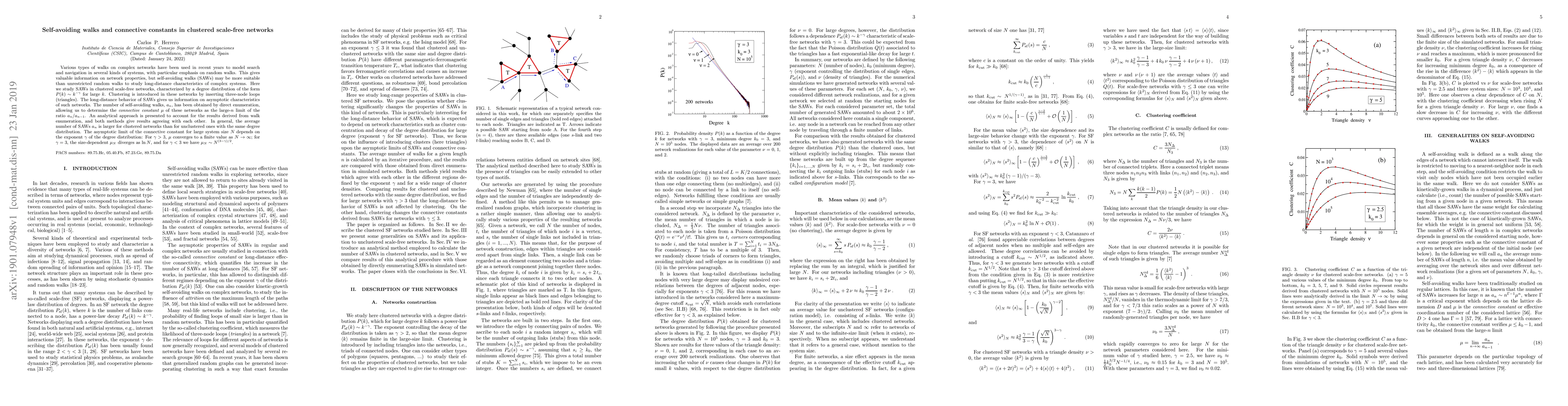 This paper investigates self-avoiding walks (SAWs) in clustered scale-free networks, determining their connective constant $\mu$ through direct enumeration and analytical methods. The study finds that clustered networks have more SAWs than unclustered ones with the same degree distribution, and $\mu$'s behavior depends on the degree distribution's exponent $\gamma$.