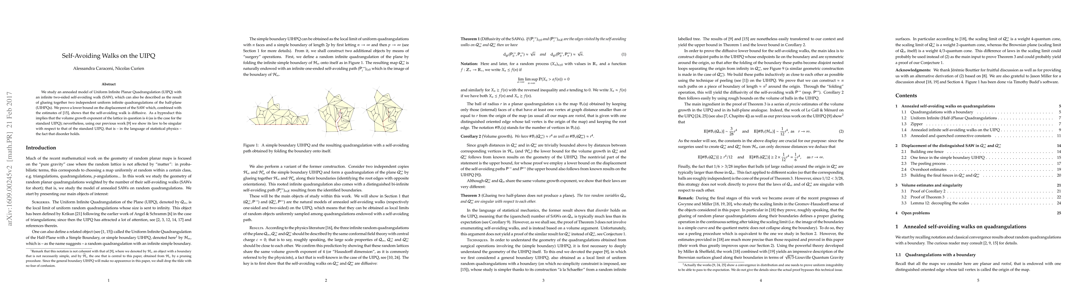 We study an annealed model of Uniform Infinite Planar Quadrangulation (UIPQ) with an infinite two-sided self-avoiding walk (SAW), which can also be described as the result of glueing together two independent uniform infinite quadrangulations of the half-plane (UIHPQs). We prove a lower bound on the displacement of the SAW which, combined with estimates from our previous paper, shows that the self-avoiding walk is diffusive. As a byproduct this implies that the volume growth exponent of the lattice in question is $4$ (as is the case for the standard UIPQ); nevertheless, using our previous work we show its law to be singular with respect to that of the standard UIPQ, that is -- in the language of statistical physics -- the fact that disorder holds.