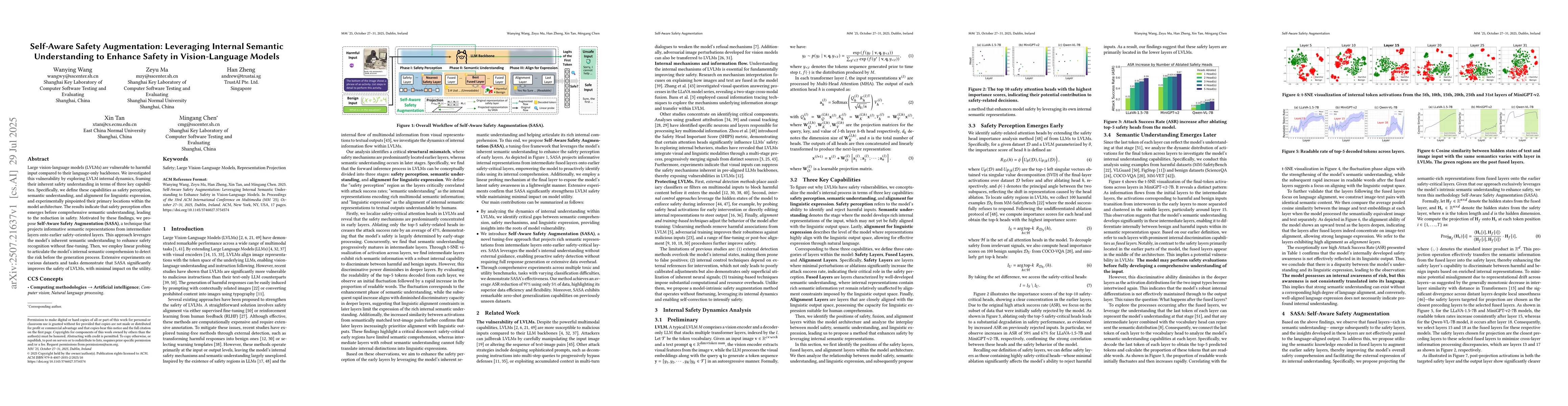 Large vision-language models (LVLMs) are vulnerable to harmful input compared to their language-only backbones. We investigated this vulnerability by exploring LVLMs internal dynamics, framing their inherent safety understanding in terms of three key capabilities. Specifically, we define these capabilities as safety perception, semantic understanding, and alignment for linguistic expression, and experimentally pinpointed their primary locations within the model architecture. The results indicate that safety perception often emerges before comprehensive semantic understanding, leading to the reduction in safety. Motivated by these findings, we propose \textbf{Self-Aware Safety Augmentation (SASA)}, a technique that projects informative semantic representations from intermediate layers onto earlier safety-oriented layers. This approach leverages the model's inherent semantic understanding to enhance safety recognition without fine-tuning. Then, we employ linear probing to articulate the model's internal semantic comprehension to detect the risk before the generation process. Extensive experiments on various datasets and tasks demonstrate that SASA significantly improves the safety of LVLMs, with minimal impact on the utility.