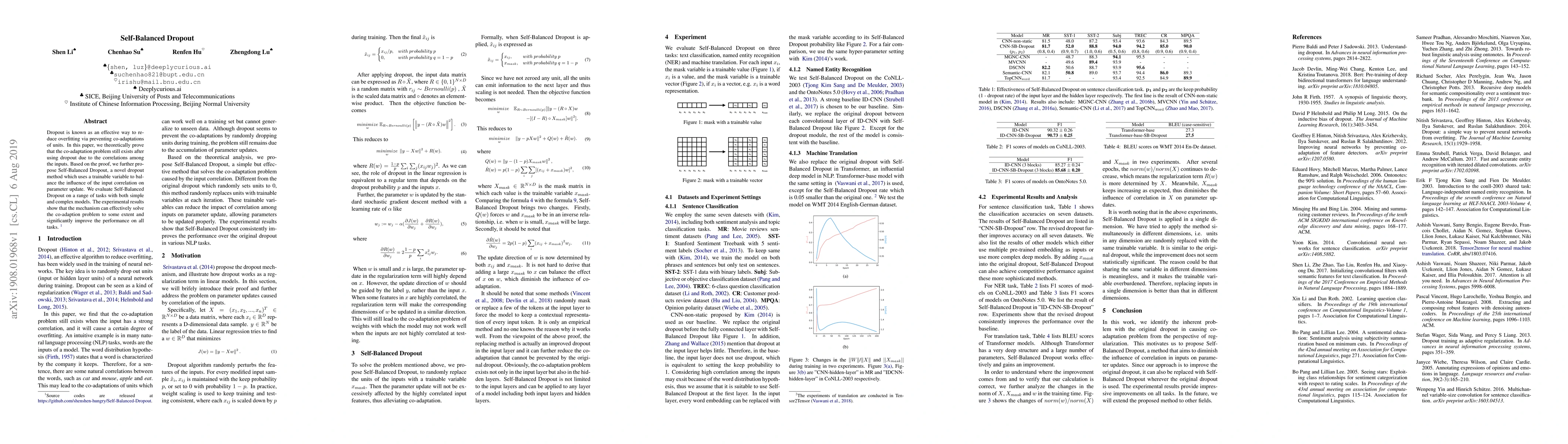 Dropout is known as an effective way to reduce overfitting via preventing co-adaptations of units. In this paper, we theoretically prove that the co-adaptation problem still exists after using dropout due to the correlations among the inputs. Based on the proof, we further propose Self-Balanced Dropout, a novel dropout method which uses a trainable variable to balance the influence of the input correlation on parameter update. We evaluate Self-Balanced Dropout on a range of tasks with both simple and complex models. The experimental results show that the mechanism can effectively solve the co-adaption problem to some extent and significantly improve the performance on all tasks.
