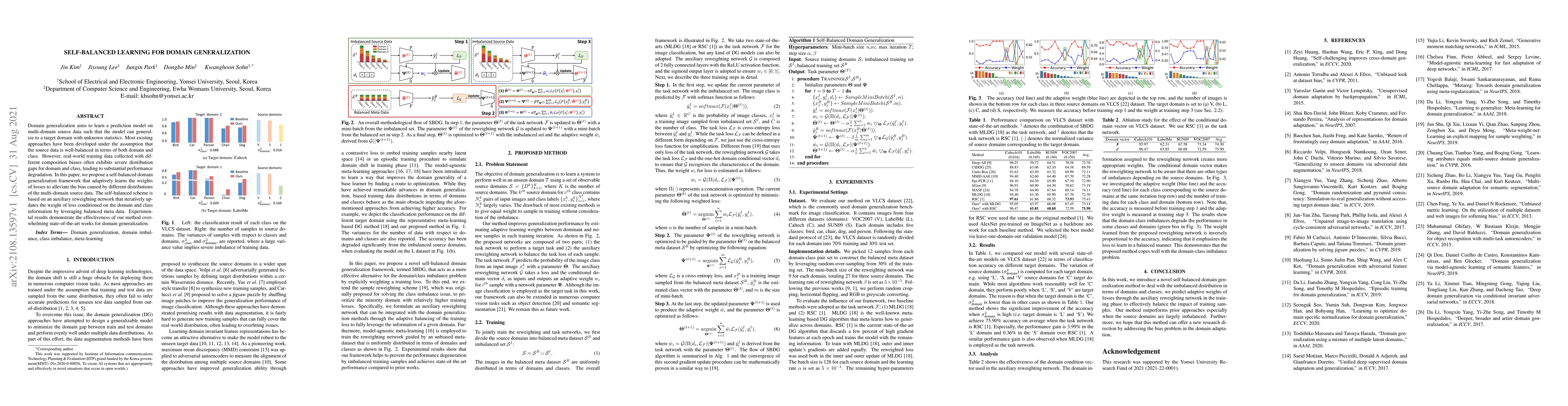 This paper proposes a self-balanced learning framework for domain generalization that addresses the issue of imbalanced source data. It introduces an auxiliary reweighting network to adaptively adjust loss weights based on domain and class information, significantly improving performance over existing methods.