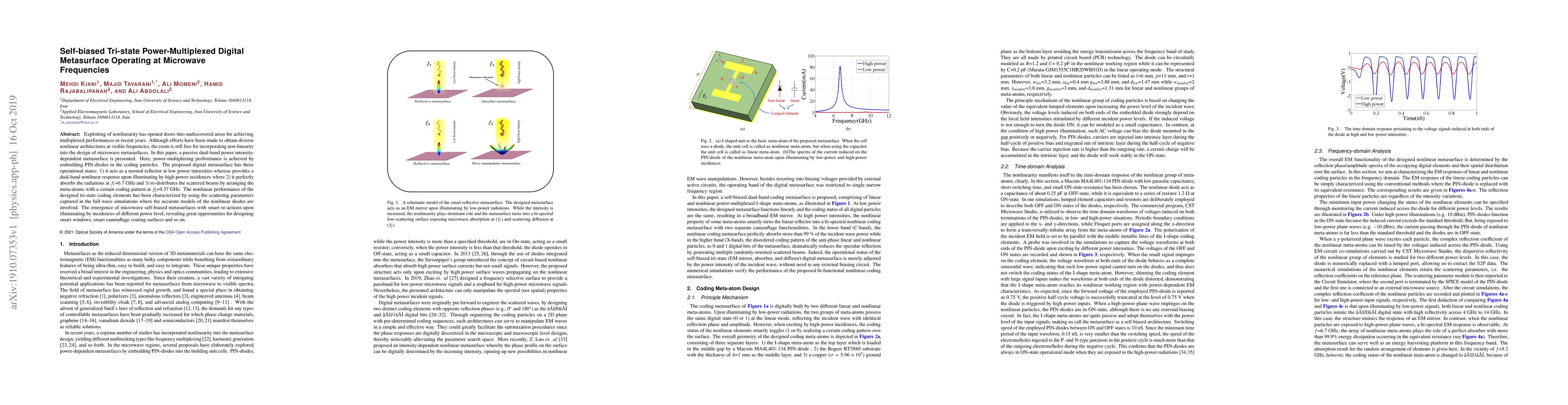 Exploiting of nonlinearity has opened doors into undiscovered areas for achieving multiplexed performances in recent years. Although efforts have been made to obtain diverse nonlinear architectures at visible frequencies, the room is still free for incorporating non-linearity into the design of microwave metasurfaces. In this paper, a passive dual-band power intensity-dependent metasurface is presented. Here, power-multiplexing performance is achieved by embedding PIN-diodes in the coding particles. The proposed digital metasurface has three operational states: 1) it acts as a normal reflector at low power intensities whereas provides a dual-band nonlinear response upon illuminating by high-power incidences where 2) it perfectly absorbs the radiations at f1=6.7 GHz and 3) re-distributes the scattered beams by arranging the meta-atoms with a certain coding pattern at f2=9.37 GHz. The nonlinear performance of the designed tri-state coding elements has been characterized by using the scattering parameters captured in the full-wave simulations where the accurate models of the nonlinear diodes are involved. The emergence of microwave self-biased metasurfaces with smart re-actions upon illuminating by incidences of different power levels, revealing great opportunities for designing smart windows, smart camouflage coating surfaces and so on.