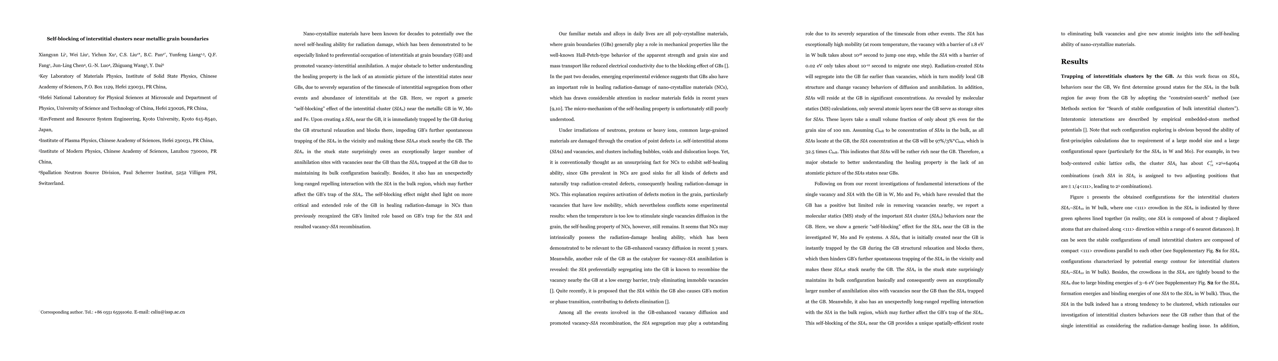 This paper reports a "self-blocking" effect of interstitial clusters near metallic grain boundaries in W, Mo, and Fe, where interstitial clusters are trapped and blocked by the grain boundary, impeding further trapping and enhancing vacancy-interstitial annihilation, thus potentially improving radiation damage self-healing in nano-crystallized materials.