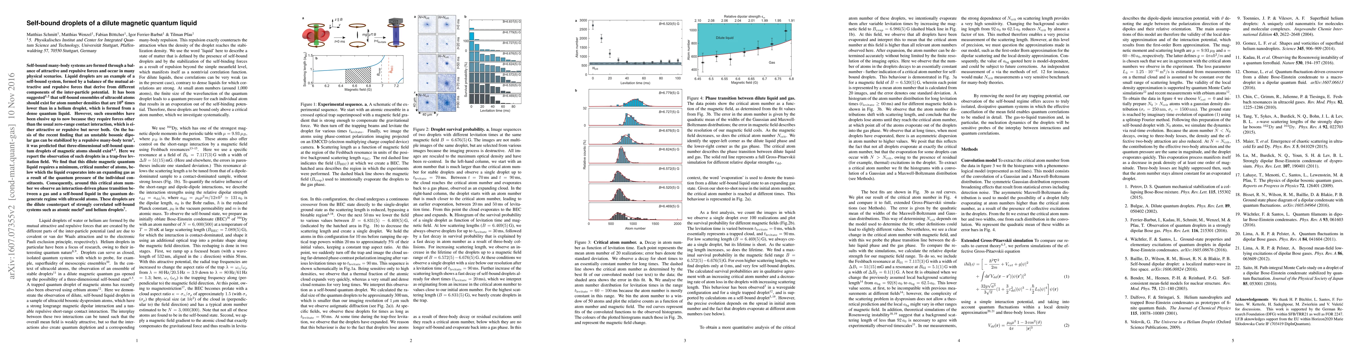 This paper reports the observation of self-bound droplets of a dilute magnetic quantum liquid formed by ultracold atoms, stabilized by a balance of attractive and repulsive forces. These droplets exhibit a critical atom number, below which they evaporate into gas due to quantum pressure, marking an interaction-driven phase transition in the quantum degenerate regime.