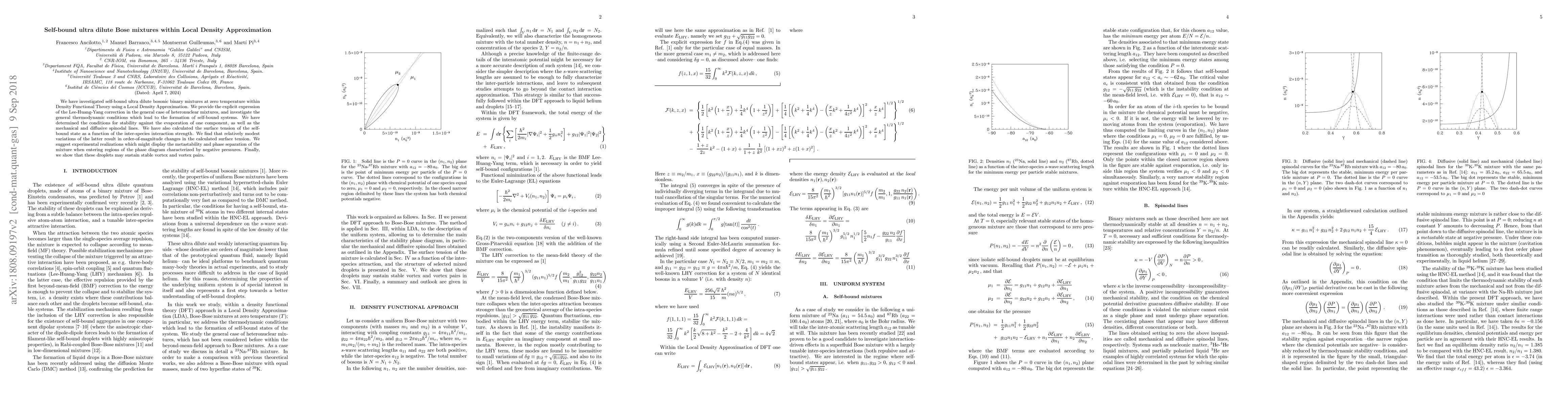 This paper investigates self-bound ultra dilute Bose mixtures at zero temperature using Density Functional Theory and Local Density Approximation, determining conditions for stability, surface tension, and potential experimental realizations of metastable droplets that can sustain vortices and vortex dimers.