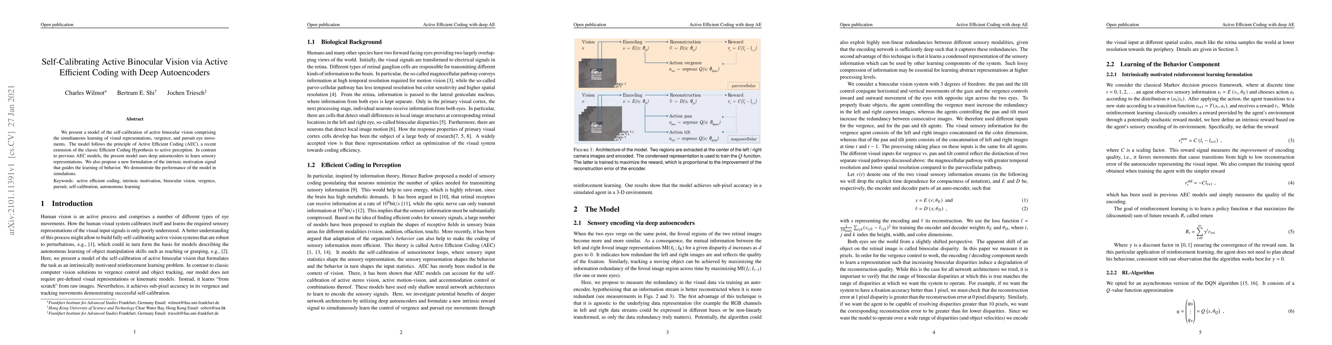 Researchers developed a model that learns to calibrate binocular vision through active perception, using deep autoencoders to improve visual representations and guide eye movements.