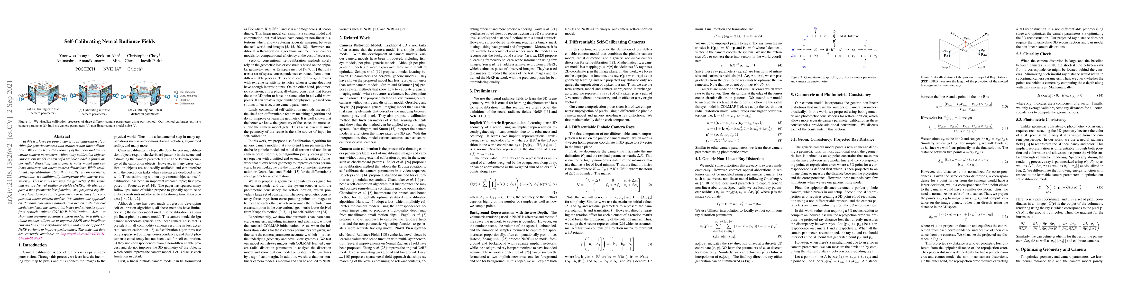 This paper proposes a self-calibration algorithm for cameras with non-linear distortions, utilizing Neural Radiance Fields to jointly learn scene geometry and camera parameters without calibration objects. The method improves performance through a new geometric loss function and demonstrates superior PSNR compared to baselines.