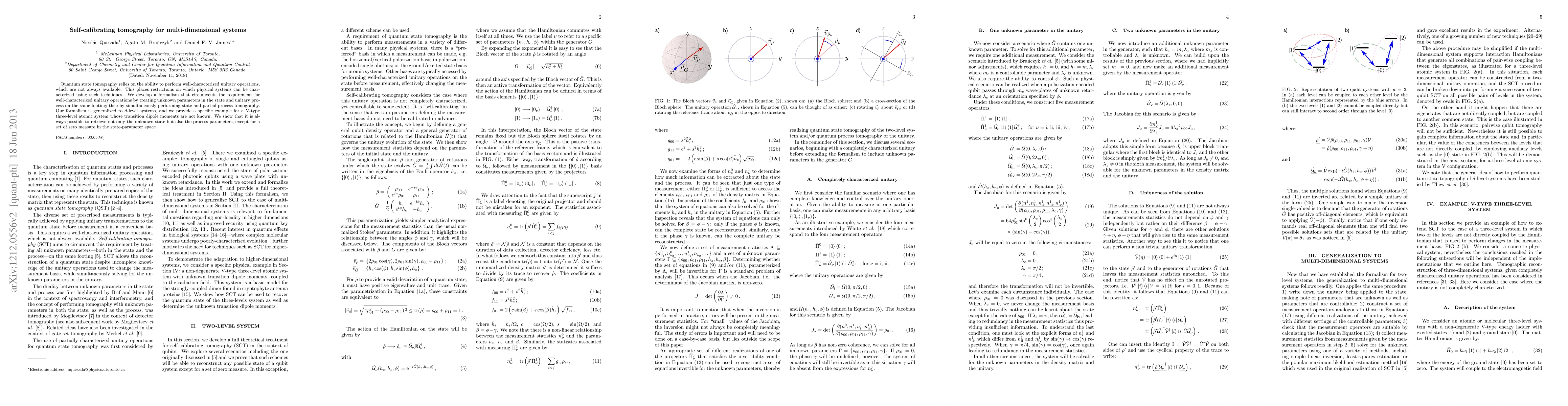 This paper introduces a formalism for self-calibrating tomography applicable to multi-dimensional quantum systems, extending the concept from qubits to qudits. It demonstrates the method's effectiveness through a specific example of a V-type three-level atomic system, showing that the unknown state and process parameters can be retrieved almost everywhere in the state-parameter space.