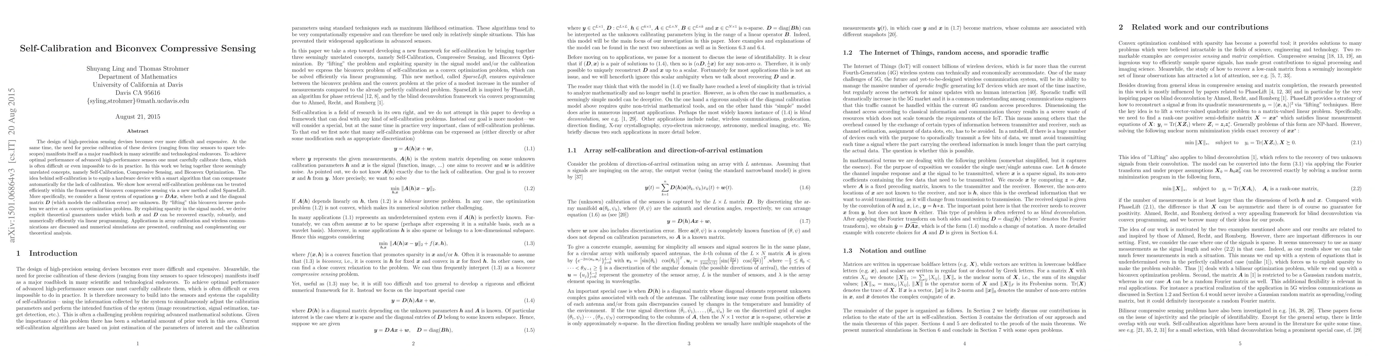 The design of high-precision sensing devises becomes ever more difficult and expensive. At the same time, the need for precise calibration of these devices (ranging from tiny sensors to space telescopes) manifests itself as a major roadblock in many scientific and technological endeavors. To achieve optimal performance of advanced high-performance sensors one must carefully calibrate them, which is often difficult or even impossible to do in practice. In this work we bring together three seemingly unrelated concepts, namely Self-Calibration, Compressive Sensing, and Biconvex Optimization. The idea behind self-calibration is to equip a hardware device with a smart algorithm that can compensate automatically for the lack of calibration. We show how several self-calibration problems can be treated efficiently within the framework of biconvex compressive sensing via a new method called SparseLift. More specifically, we consider a linear system of equations y = DAx, where both x and the diagonal matrix D (which models the calibration error) are unknown. By "lifting" this biconvex inverse problem we arrive at a convex optimization problem. By exploiting sparsity in the signal model, we derive explicit theoretical guarantees under which both x and D can be recovered exactly, robustly, and numerically efficiently via linear programming. Applications in array calibration and wireless communications are discussed and numerical simulations are presented, confirming and complementing our theoretical analysis.