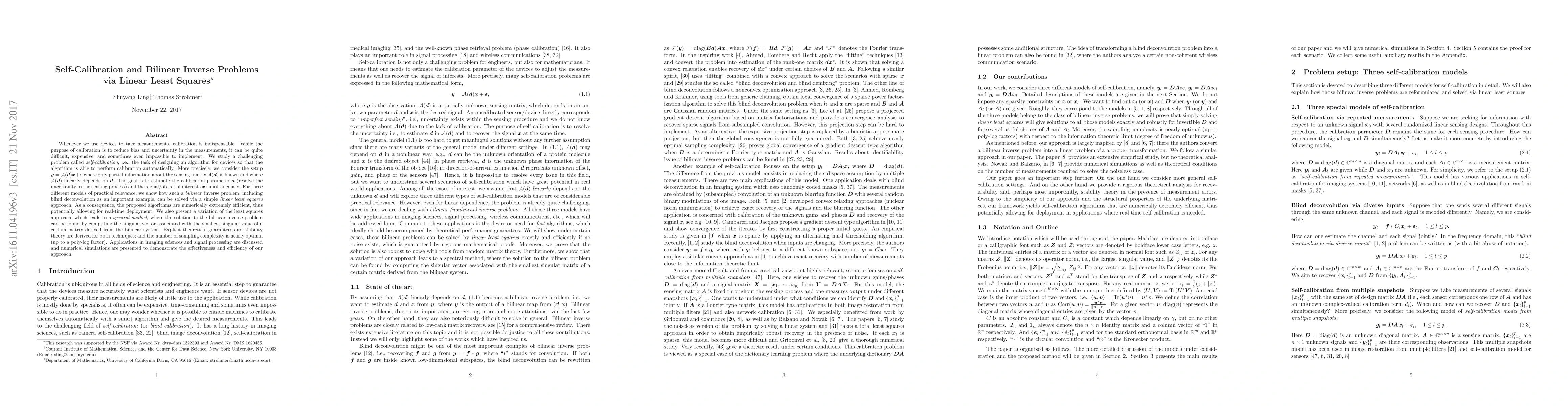 Whenever we use devices to take measurements, calibration is indispensable. While the purpose of calibration is to reduce bias and uncertainty in the measurements, it can be quite difficult, expensive, and sometimes even impossible to implement. We study a challenging problem called \emph{self-calibration}, i.e., the task of designing an algorithm for devices so that the algorithm is able to perform calibration automatically. More precisely, we consider the setup $\boldsymbol{y} = \mathcal{A}(\boldsymbol{d}) \boldsymbol{x} + \boldsymbol{\epsilon}$ where only partial information about the sensing matrix $\mathcal{A}(\boldsymbol{d})$ is known and where $\mathcal{A}(\boldsymbol{d})$ linearly depends on $\boldsymbol{d}$. The goal is to estimate the calibration parameter $\boldsymbol{d}$ (resolve the uncertainty in the sensing process) and the signal/object of interests $\boldsymbol{x}$ simultaneously. For three different models of practical relevance, we show how such a \emph{bilinear} inverse problem, including blind deconvolution as an important example, can be solved via a simple \emph{linear least squares} approach. As a consequence, the proposed algorithms are numerically extremely efficient, thus potentially allowing for real-time deployment. We also present a variation of the least squares approach, which leads to a~\emph{spectral method}, where the solution to the bilinear inverse problem can be found by computing the singular vector associated with the smallest singular value of a certain matrix derived from the bilinear system. Explicit theoretical guarantees and stability theory are derived for both techniques; and the number of sampling complexity is nearly optimal (up to a poly-log factor). Applications in imaging sciences and signal processing are discussed and numerical simulations are presented to demonstrate the effectiveness and efficiency of our approach.